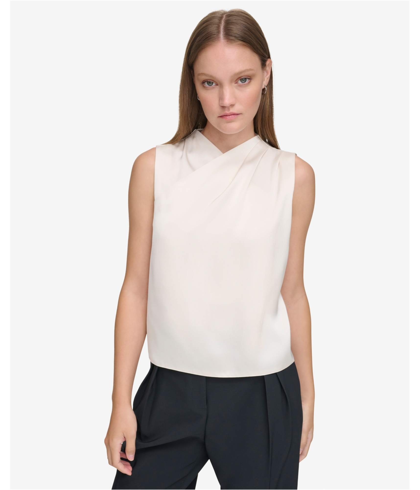 The draped V-neckline on this sleeveless blouse offers a sophisticated and modern silhouette, perfect for any occasion. Its flowing design moves beautifully with you, ensuring you look and feel effortlessly chic. Imagine pairing this with tailored trousers for a polished office look or with a sleek skirt for an evening out. The medium-weight construction provides a smooth drape and an opaque finish, giving you confidence with every wear. This versatile top is designed to be a staple in your wardrobe, offering timeless style with a touch of modern flair.