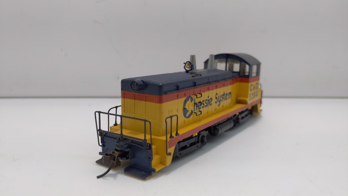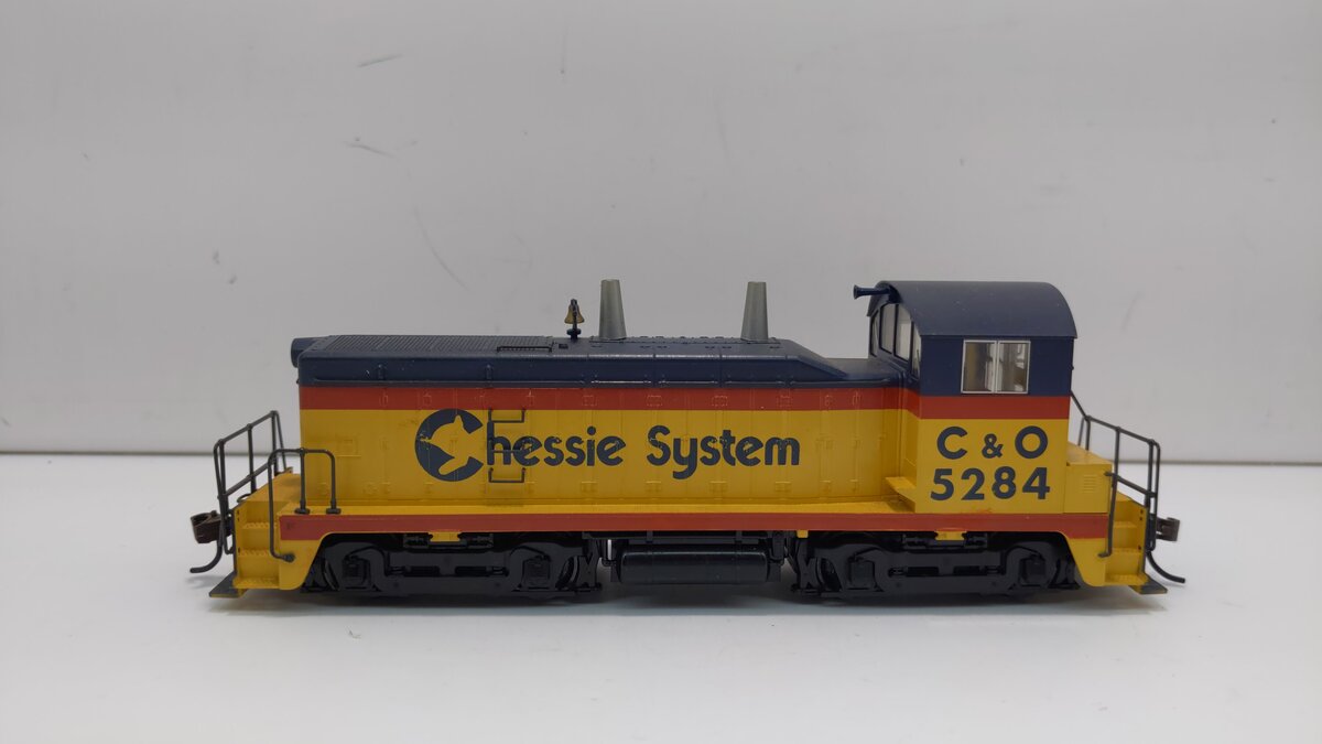 Here is a Kato 37-115 HO Scale Chessie EMD NW2 Phase II Diesel Locomotive #5284. This locomotive features a plastic body construction with plastic trucks, metal wheels, a motor, and operating knuckle couplers.