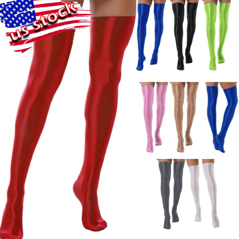 1 Pair Womens Glossy Thigh High Stockings Solid Color Stretchy Socks.