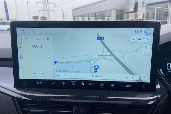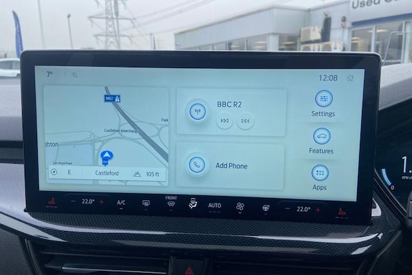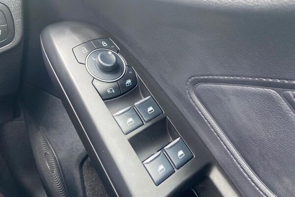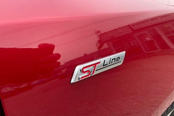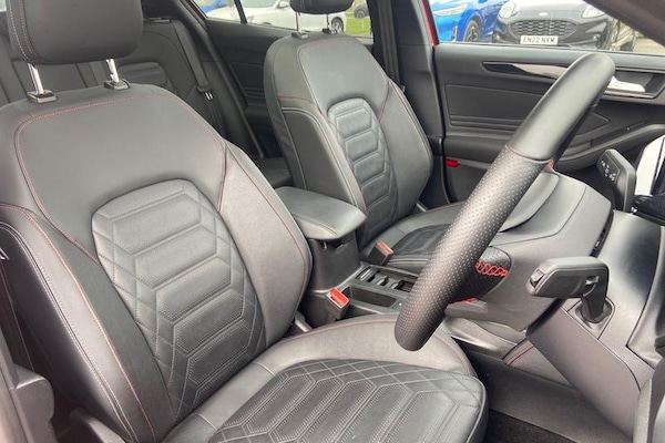 12.3 Digital instrument cluster, Bluetooth system, Digital clock, Easy fuel capless refuelling system, Eco mode, Ford SYNC4 Nav with 13.2'' touchscreen, DAB, Emergency Assistance, Apple Carplay & Android Auto, B&O Premium Audio with 10 speakers, FordPass Connect, Lane keeping system - lane keeping alert and lane keeping aid, PAS, Rev counter, Selectable drive mode, Service interval indicator, Trip computer, Wireless charging pad, Auto headlamps (on/off), Body coloured door handles, Electrically operated front and rear windows with one touch opening and closing, Electrically operated heated power fold door mirrors with puddle lamp with side indicators, Front variable intermittent wipers with electric wash, Heated rear window, LED daytime running lamp, LED rear lamps, LED third brake light, Polished twin tailpipe, Privacy glass, Quickclear heated windscreen, Rain sensor, Rear side wing doors, Tailgate wash/wipe, Unique ST-Line grille, full bodystyling kit, and large body coloured rear roof spoiler, 3 rear headrests, 3 seat bench in 2nd row, Dual zone electronic air temperature control, Full sensico premium upholstery, Height adjustable front headrests, Isofix child seat preparation, Load through ski hatch, Manual 2-way passenger seat adjust, Power 4-way driver seat adjust, with power lumbar adjust, Reach + rake adjustable steering column, Single front passenger seat, 3x3 point rear seatbelts, ABS+Electronic Brake force Distribution, Auto hold function, Driver airbag, EDL