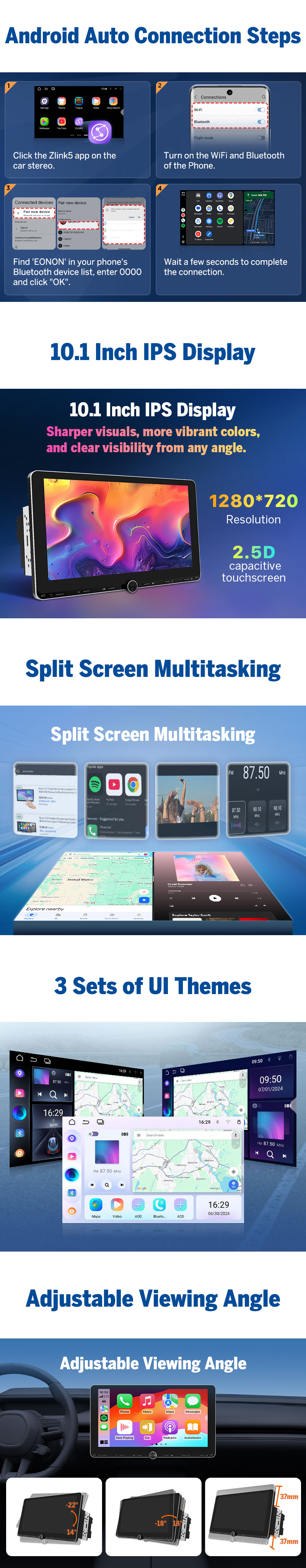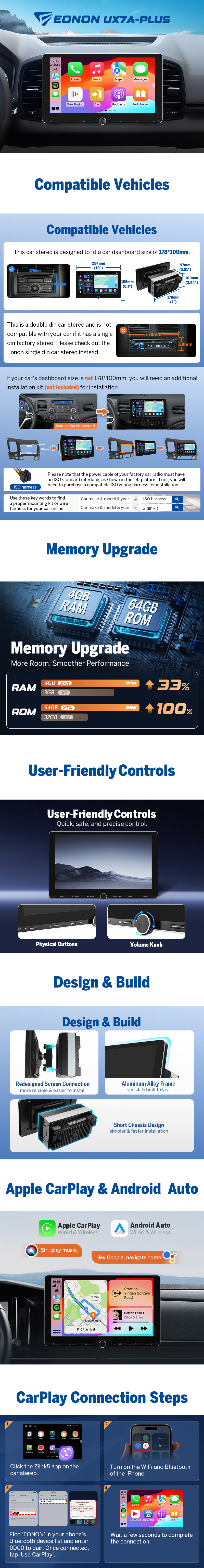 This Android car stereo is optimized for shoppers seeking a modern Double DIN upgrade with advanced features like the latest Android version, Wireless CarPlay, Android Auto, and GPS Navi support. It’s engineered for smooth performance with enhanced RAM/ROM efficiency, pro-level DSP tuning, and a responsive HD touchscreen ideal for Split-Screen multitasking. Designed for easy installation in 2 DIN vehicles, it also offers Bluetooth 5.4, WiFi 6 connectivity, and broad compatibility with popular cars and aftermarket accessories. A great choice for drivers wanting smarter navigation, seamless smartphone integration, and a future-ready in-dash system. Eonon Double Din 10.1" Android 7.1 8Core Car Stereo GPS Nav System Touch E WiFi