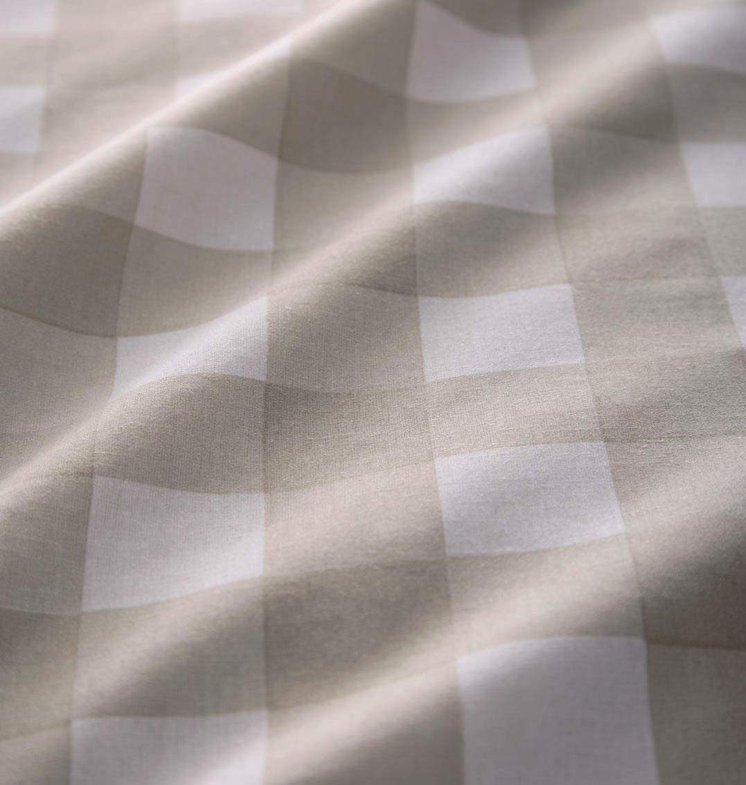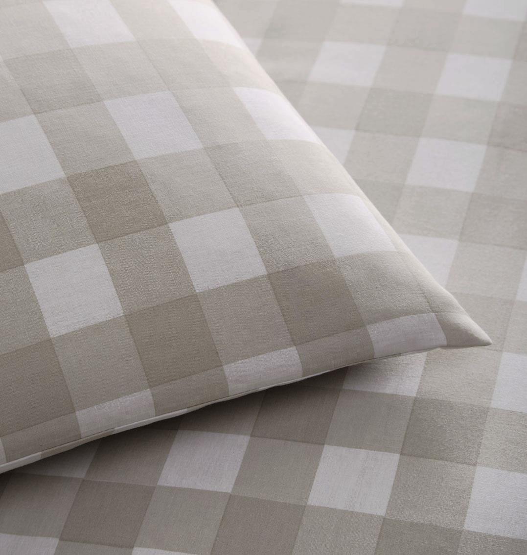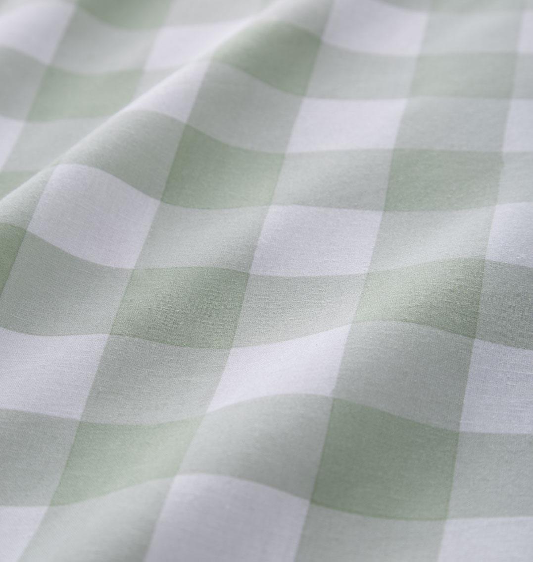 This duvet set features a classic gingham check pattern, where soft squares of natural Stone and sage green alternate with white in a balanced, symmetrical design. The natural tone offers a warm, neutral base reminiscent of undyed cotton or linen, while the sage brings a muted, earthy green hue—perfect for evoking a serene, nature-inspired feel.