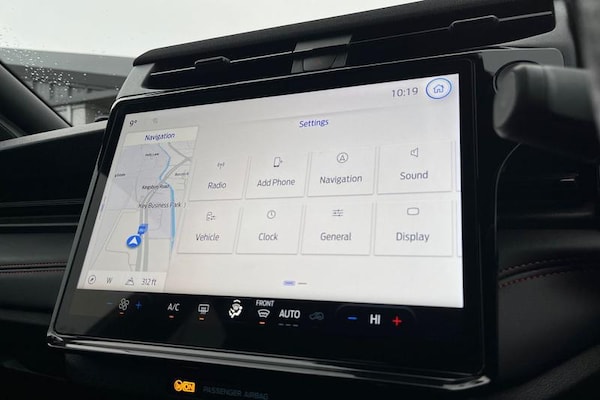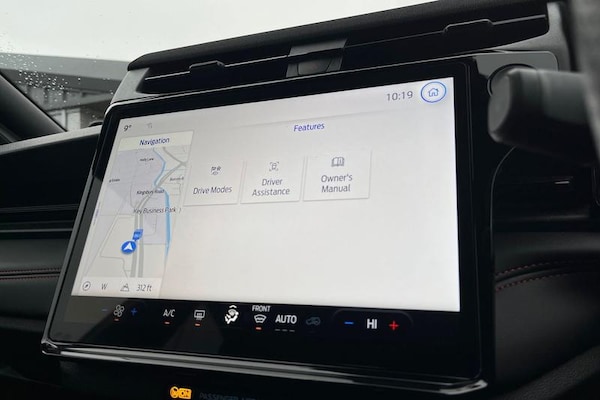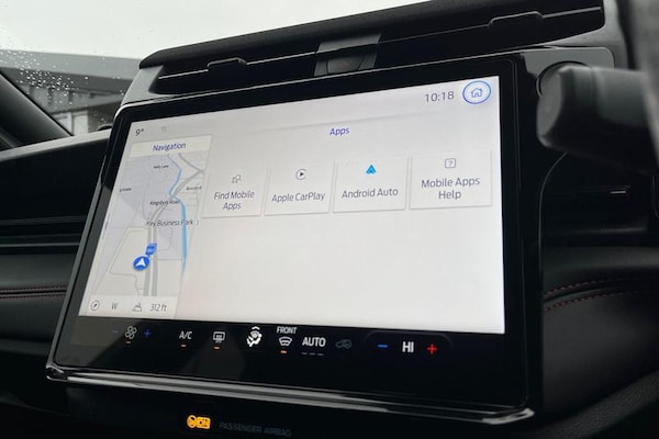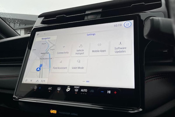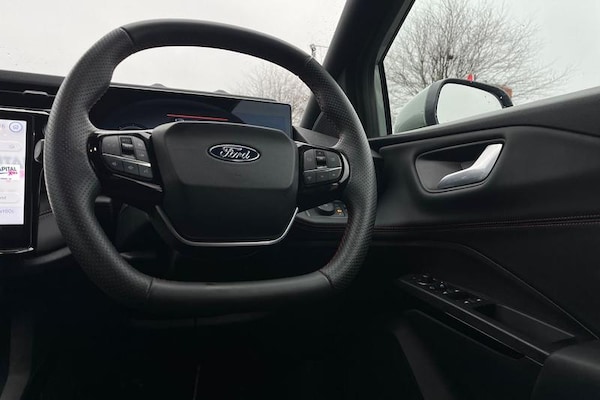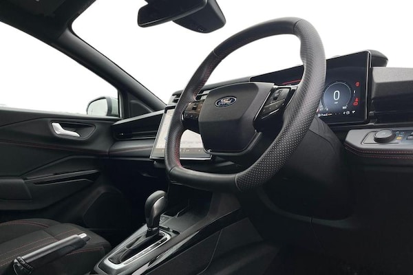 Driver impairment monitor, Emergency call service, Ford easy fuel, Full digital 12.8 instrument cluster, Lane keeping aid with lane departure warning, Power assist steering, Selectable drive modes(Normal, Eco, Sport, Slippery and Trail), Speed sign recognition, Automatic headlights with rain sensing wipers and auto high beam, Front fog lamps, LED daytime running lights, LED rear lamps, LED third brake light, Power foldable heated door mirrors with puddle lamps and puma logo protection, Quickclear heated windscreen, Rear privacy glass, Rear side wing doors, Rear wiper, ST-Line body styling kit with unique grille, 3 seat bench in 2nd row, Centre console with armrest and stowage, Electronic automatic temperature control (EATC), Ford megabox extended bootspace, Front and rear head restraints, Front floor mats, Manual 4 way driver seat adjust with lumbar adjustment, Single front passenger seat, ST- Line cloth trim with red stitching, 3 rear seatbelts, Child safety lock, Electronic stability control (ESC) and hill start assist, Pre-collision assist with autonomous emergency braking, pedestrian/cyclist detection & post-collision braking, Tyre pressure monitoring system (TPMS)