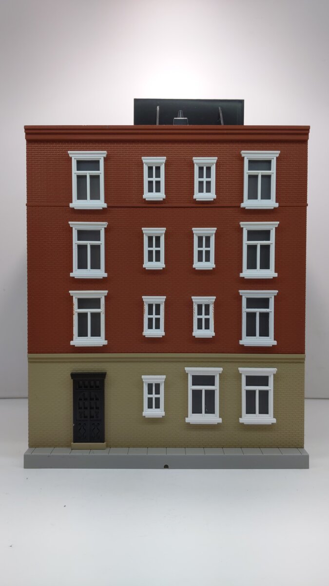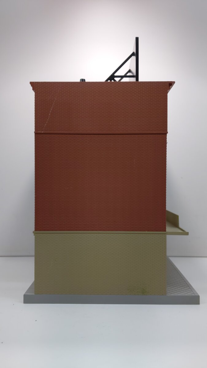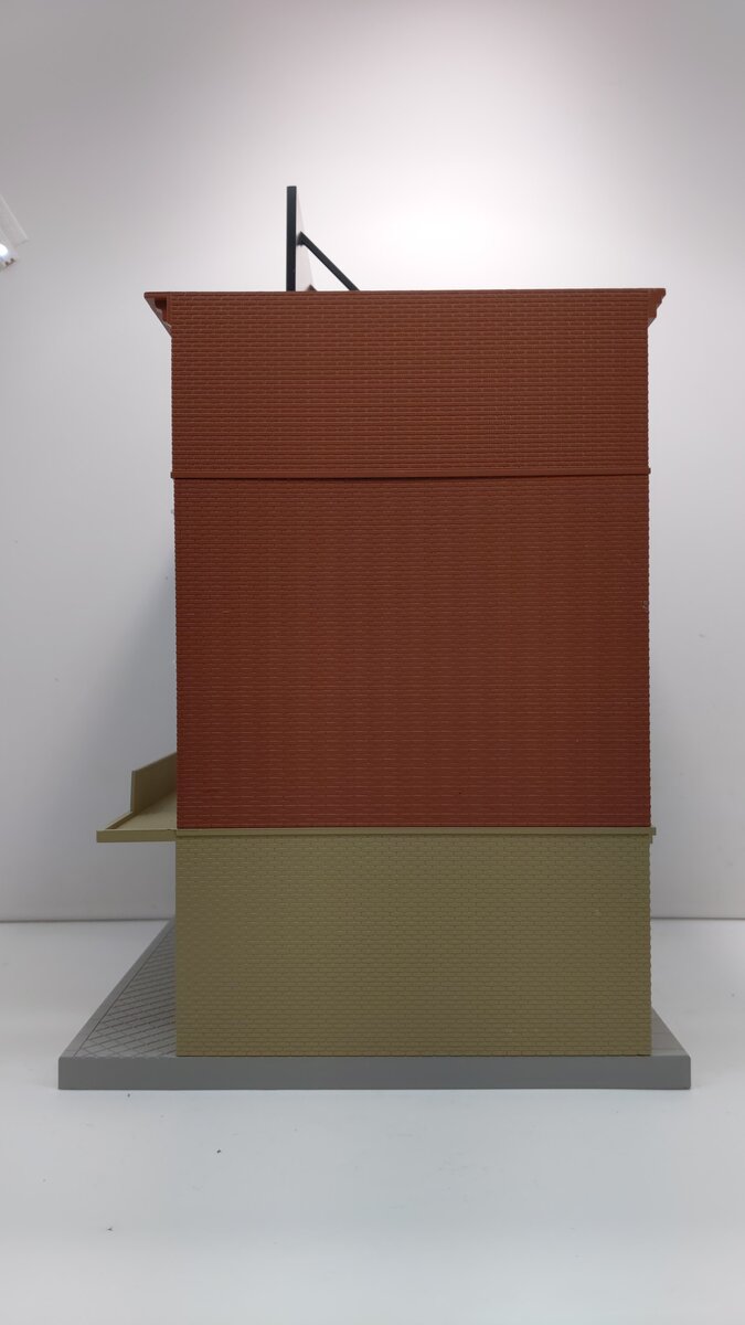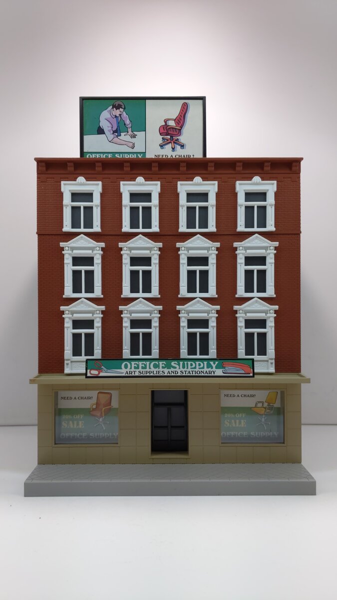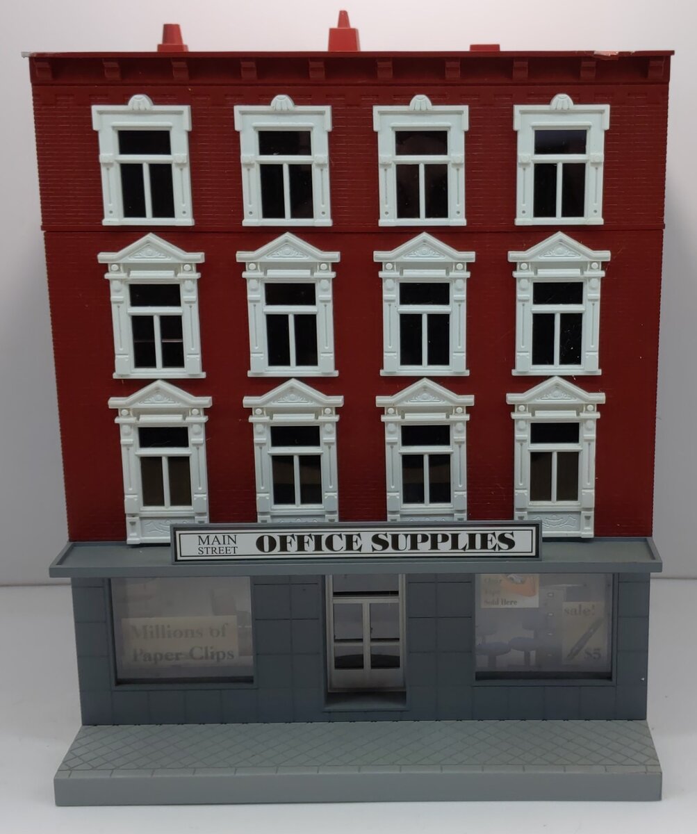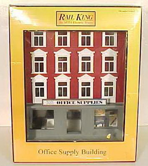 This is a MTH 30-9013 O Four Story Office Supply Building. This building features a plastic body construction with highly detailed painting. It measures about 14 inches tall and can be lighted.