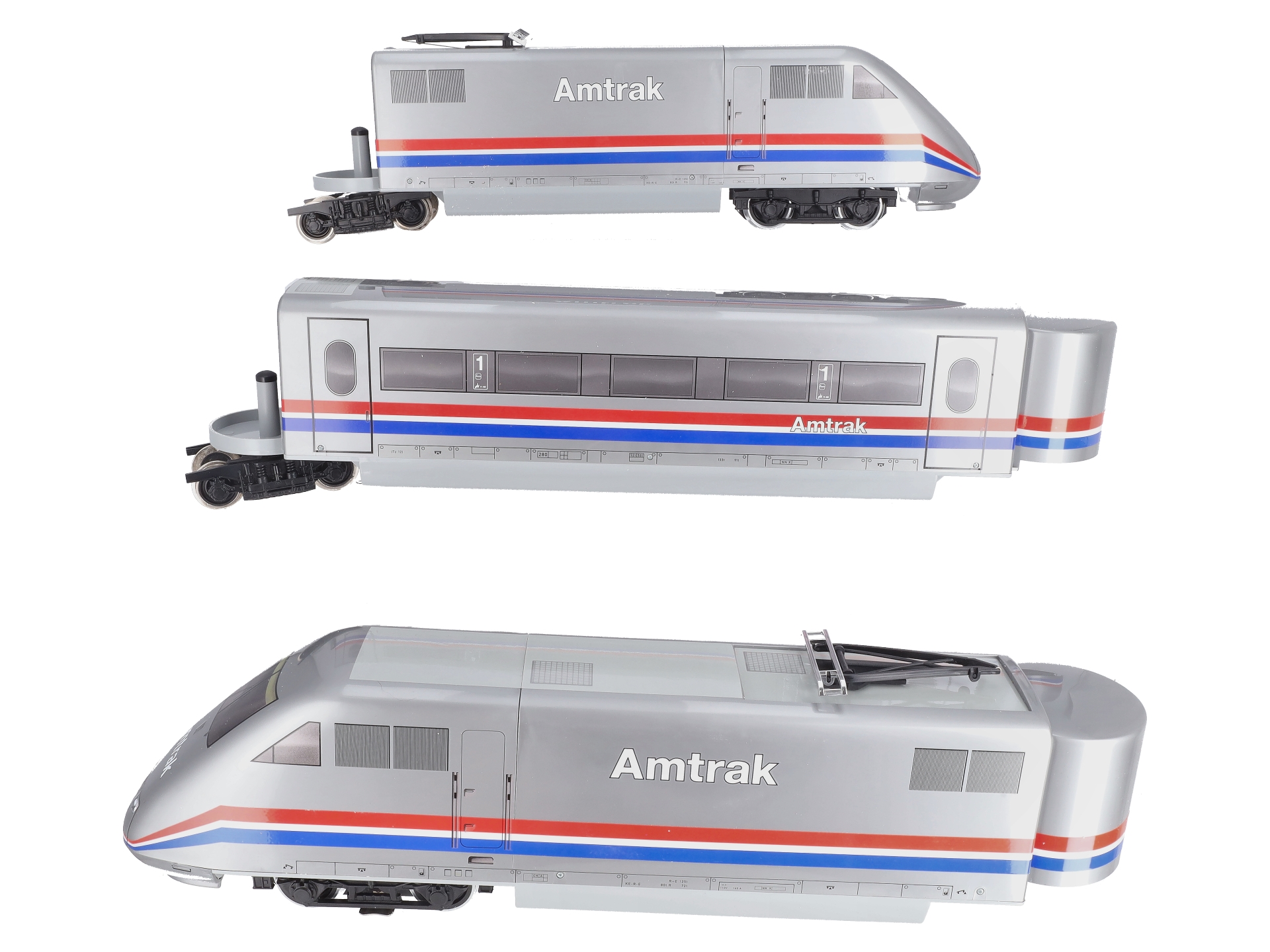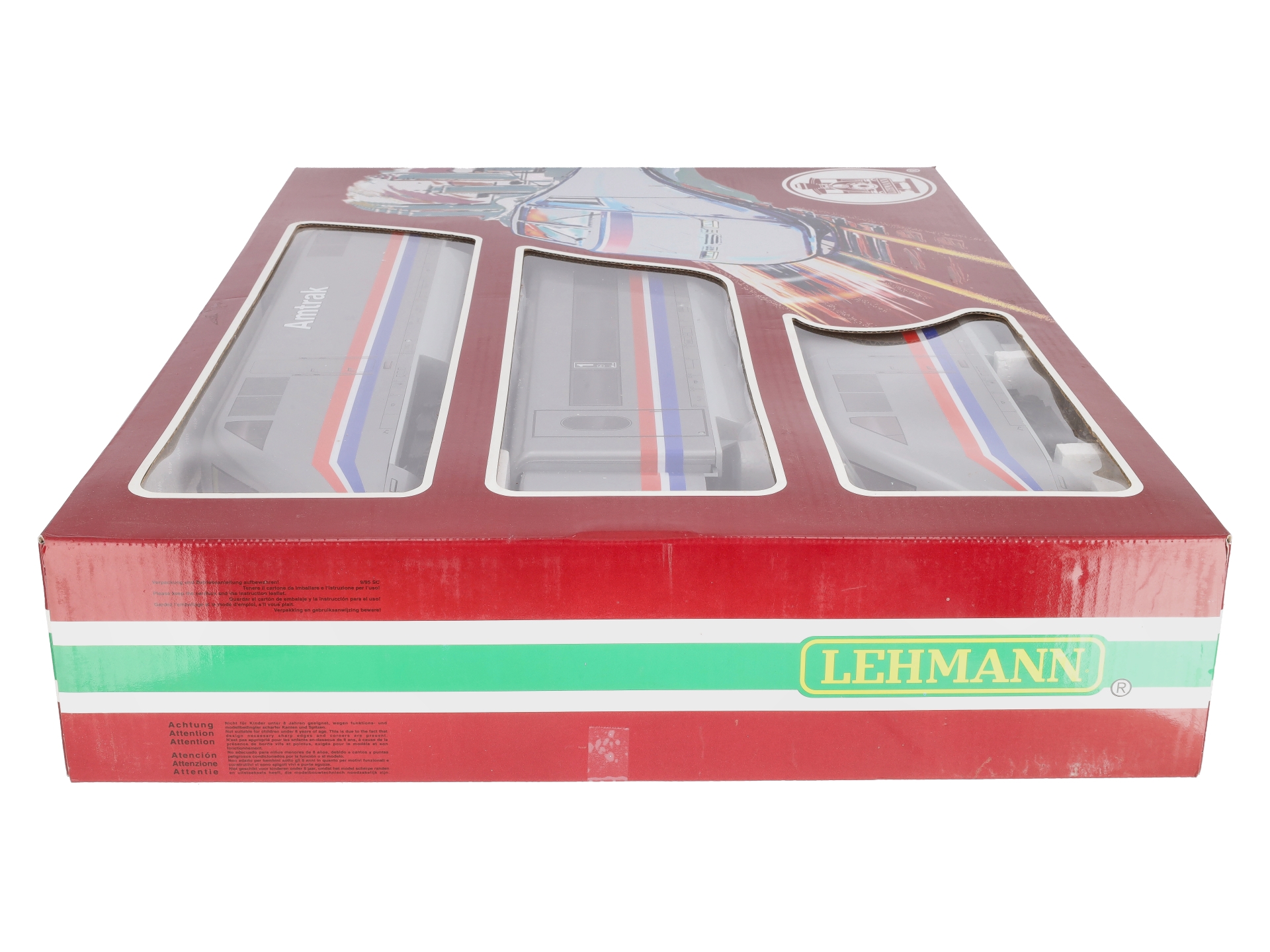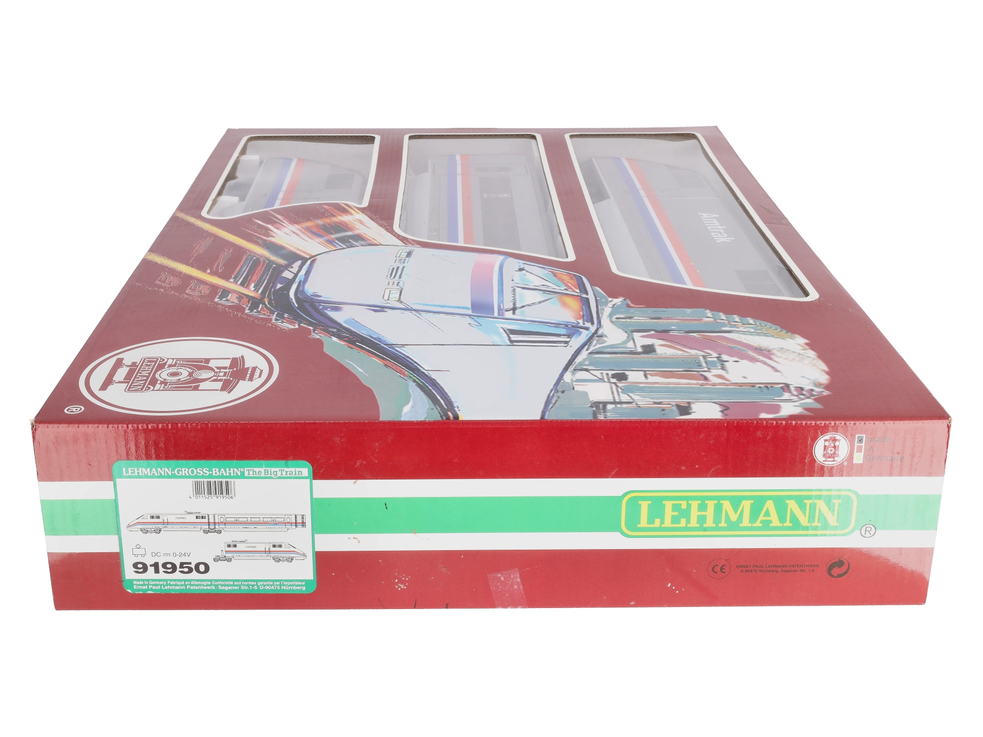 This is an LGB 91950 Amtrak Powered ABA High Speed Train Set. The LGB 91950 is a model of Amtrak‘s high-speed trains used on the Northeast Corridor between Washington, DC and Boston. This set measures over 66 inches long and is designed for indoor and outdoor use. Features include a motor, operating lights, plastic trucks and metal wheels.