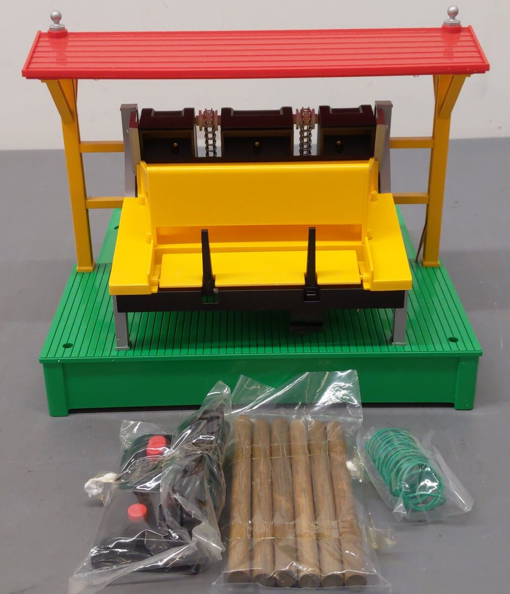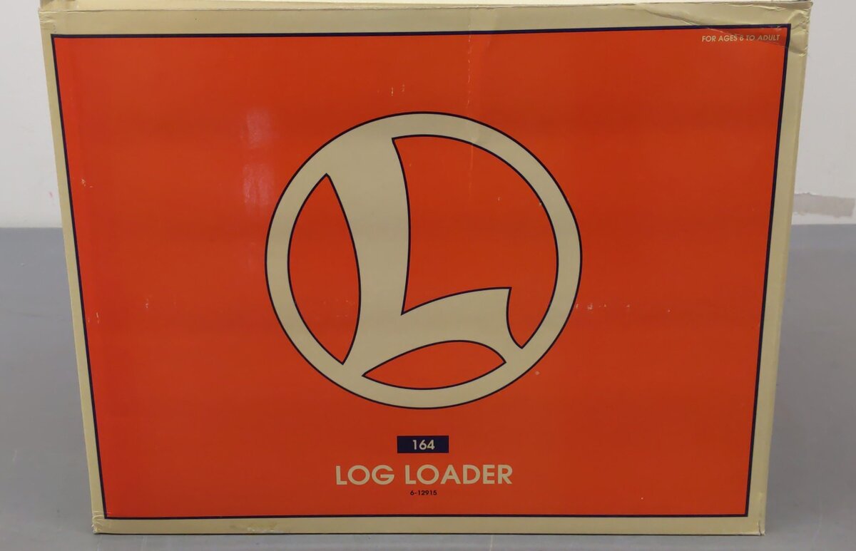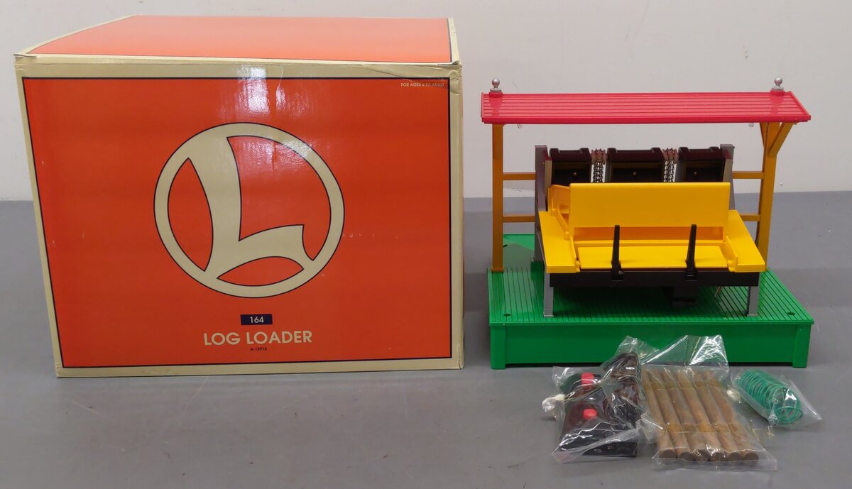 This is a Lionel 6-12915 O 164 Operating Log Loader. This is the modern version of the 164 made from 1940 through the 50's. This needs a track run in front and behind it to work properly. You bring your log dump car to the front of it and dump the logs in. Then you turn it on which lifts the logs up and over the top of it and into the holding tray on the back side. Then by spotting a car on the back side and pressing the unload button will dump the logs into your waiting car. This modern version is much quieter than the postwar version. Six logs are included with this item.