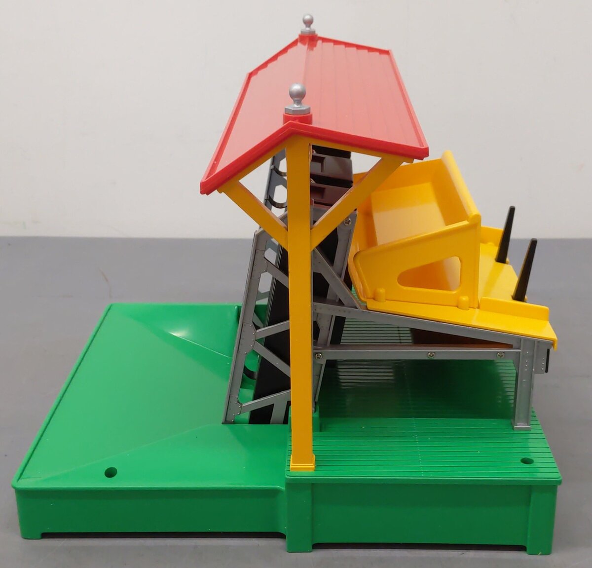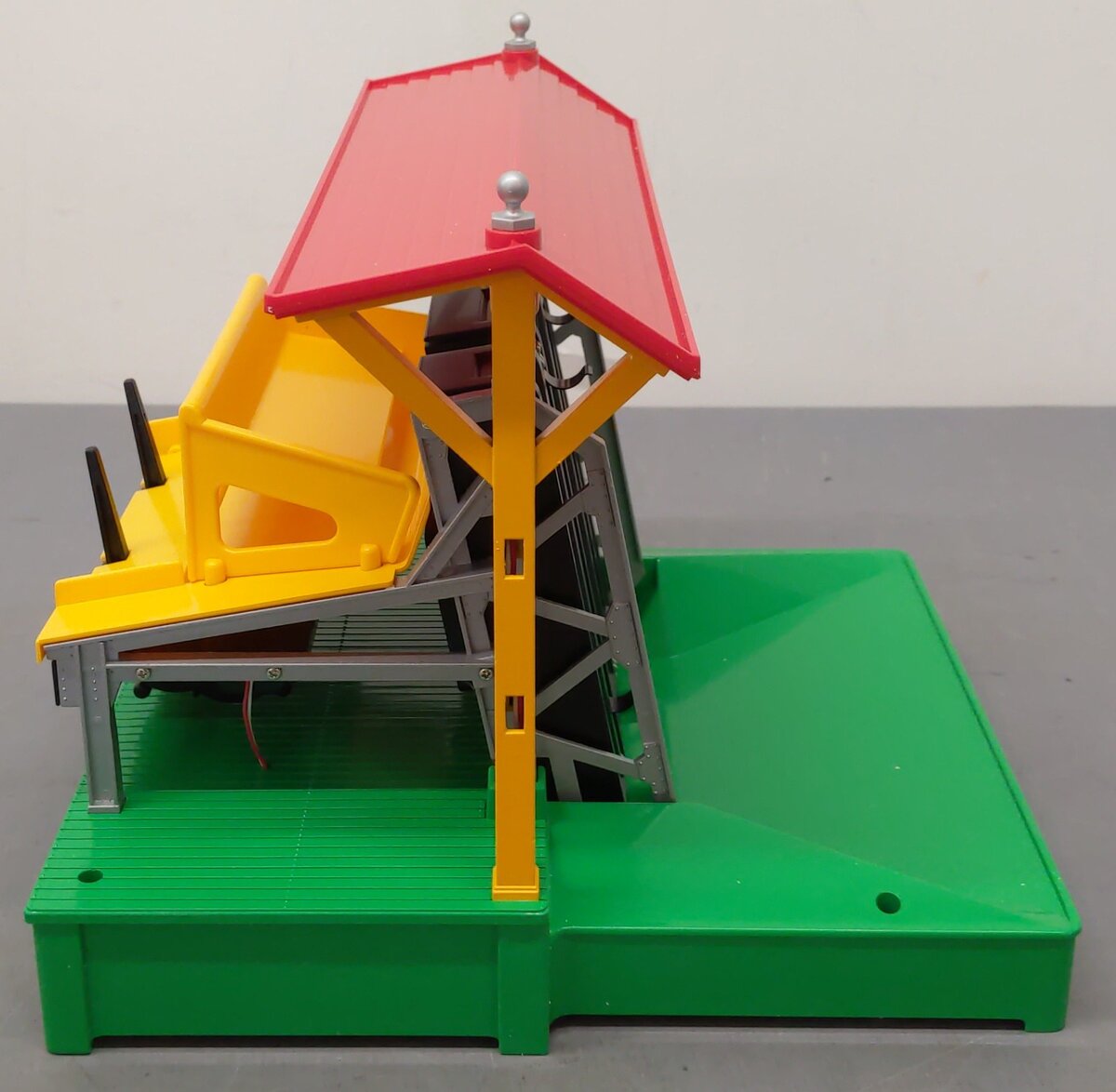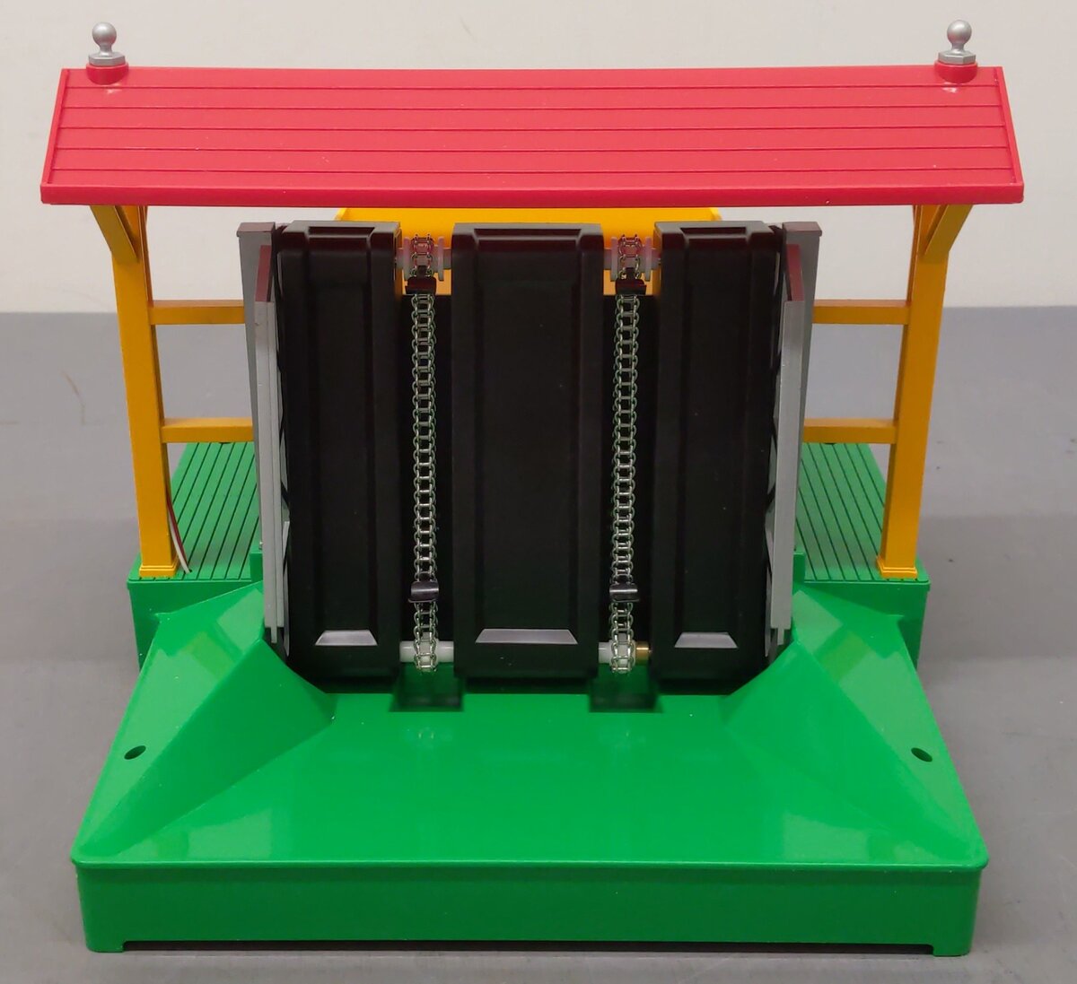 This is a Lionel 6-12915 O 164 Operating Log Loader. This is the modern version of the 164 made from 1940 through the 50's. This needs a track run in front and behind it to work properly. You bring your log dump car to the front of it and dump the logs in. Then you turn it on which lifts the logs up and over the top of it and into the holding tray on the back side. Then by spotting a car on the back side and pressing the unload button will dump the logs into your waiting car. This modern version is much quieter than the postwar version. Six logs are included with this item.