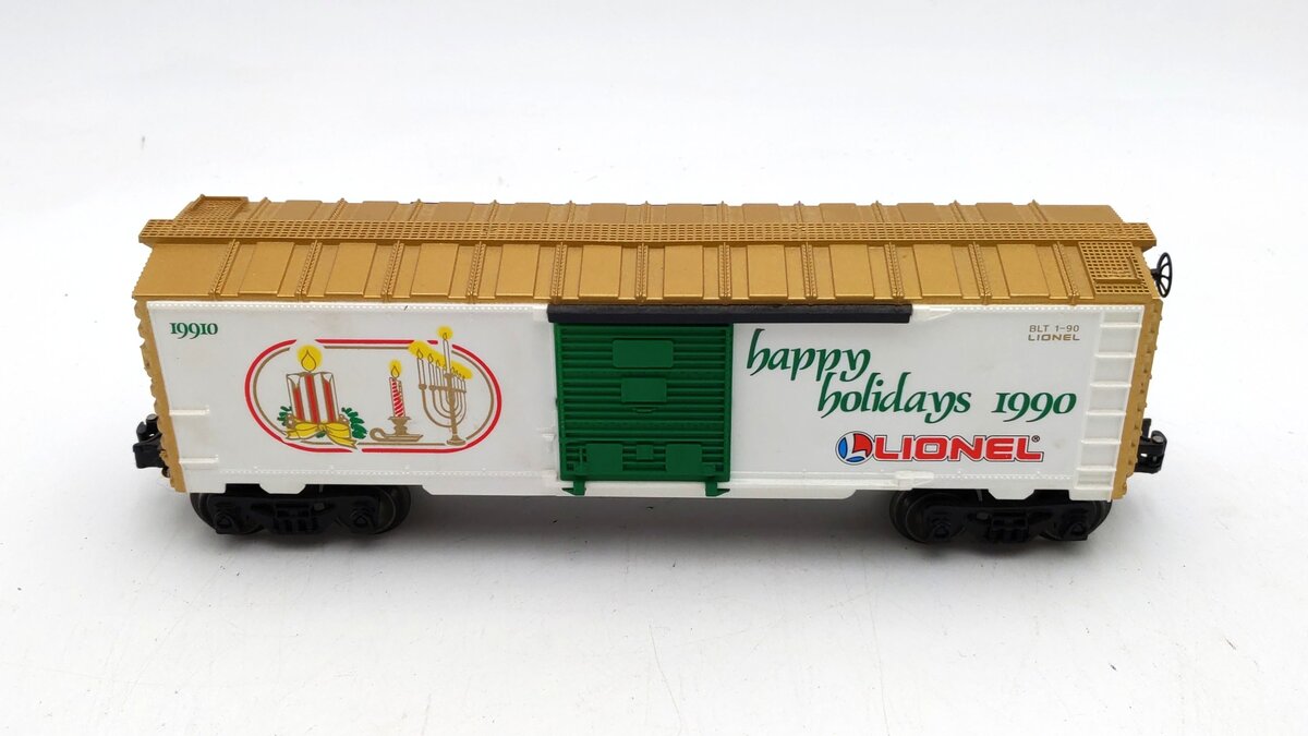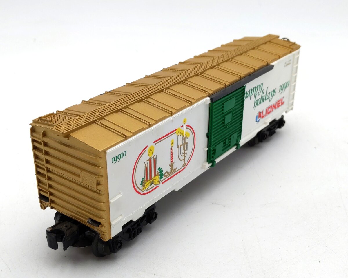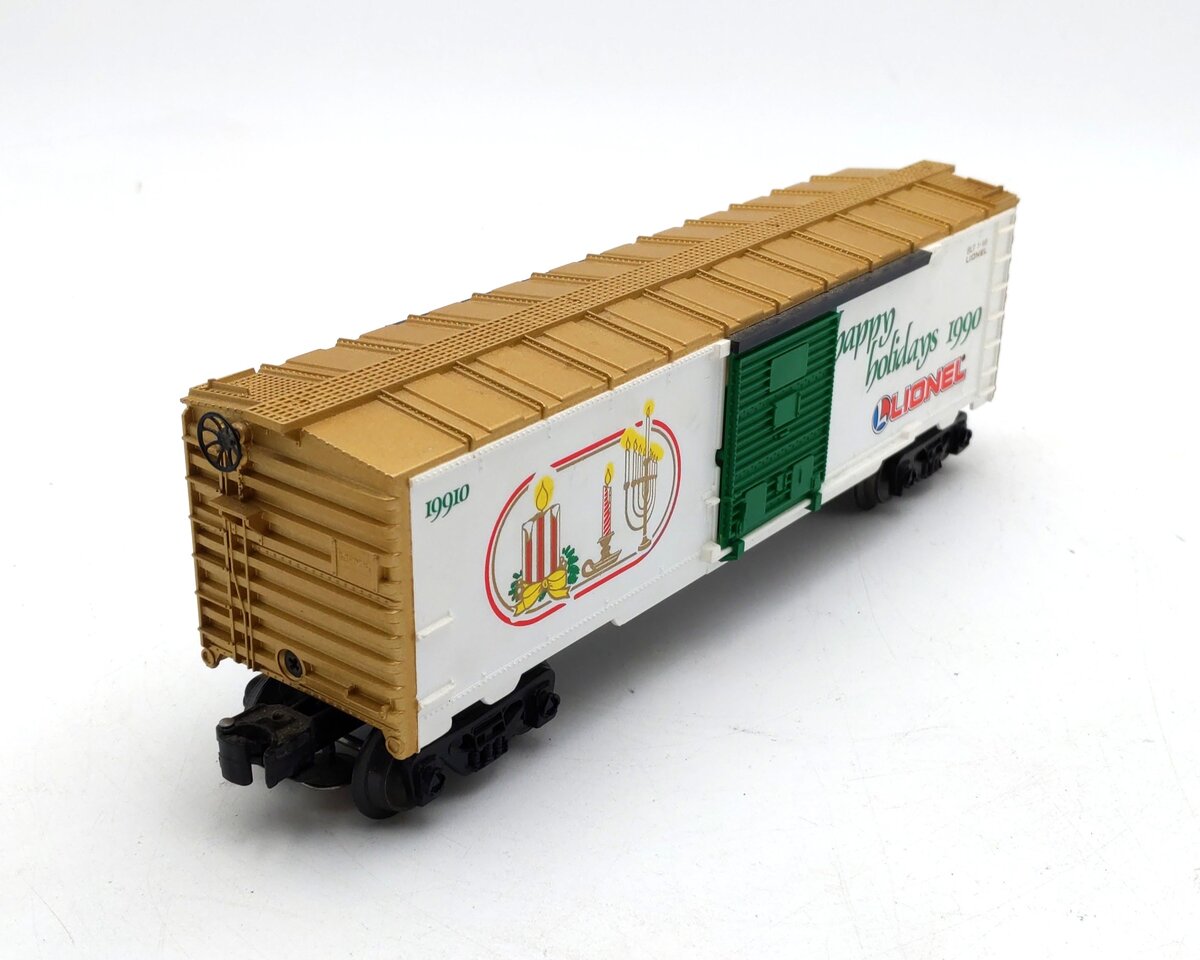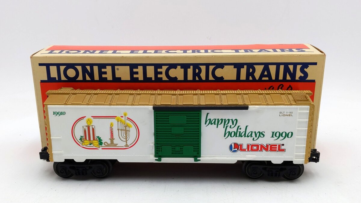 This is a Lionel 6-19910 O Gauge 1990 Seasons Greetings Box Car. This boxcar features a durable plastic construction with sliding doors, plastic trucks, operating knuckle couplers, metal wheels and axles, and attractive decoration.