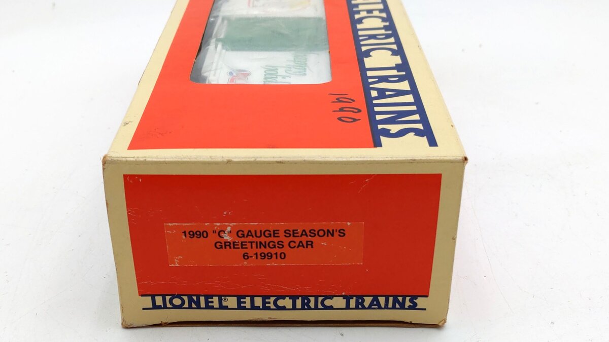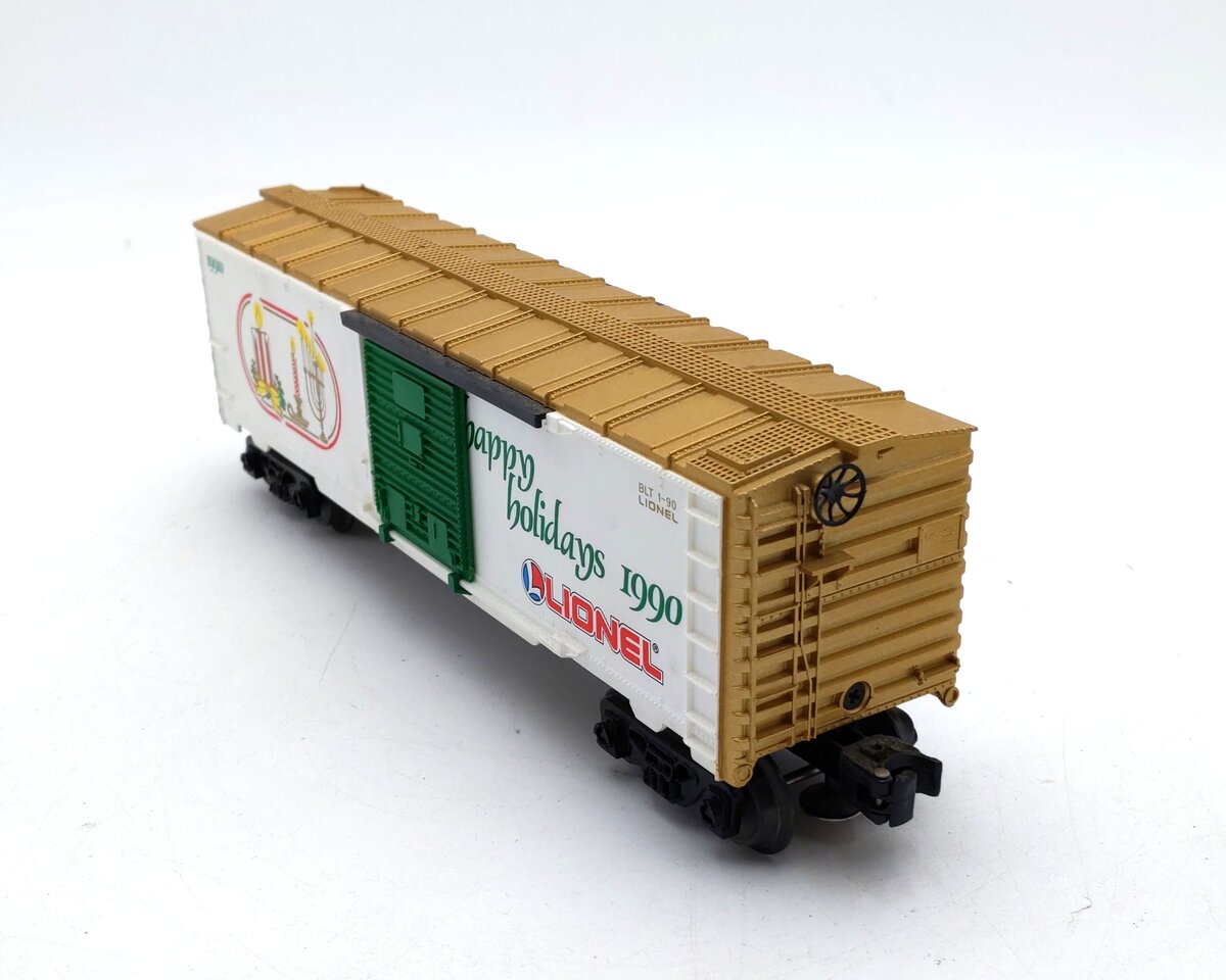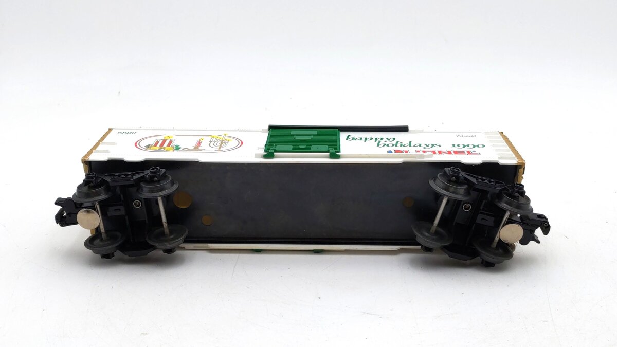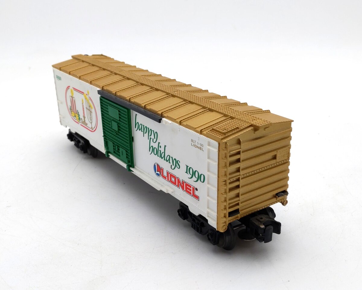 This is a Lionel 6-19910 O Gauge 1990 Seasons Greetings Box Car. This boxcar features a durable plastic construction with sliding doors, plastic trucks, operating knuckle couplers, metal wheels and axles, and attractive decoration.