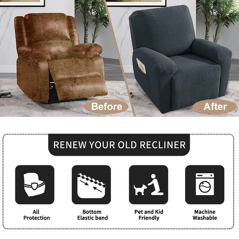 Our slipcovers for recliner chairs adopted all-around coverage design which can protect your recliner from daily wear and accidental stains, like footprint, pet scratches, bites, and Pet footprints, free you from the worries of recliner chair wear or dirty.