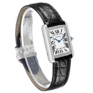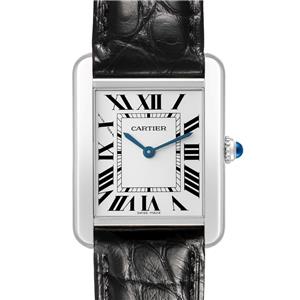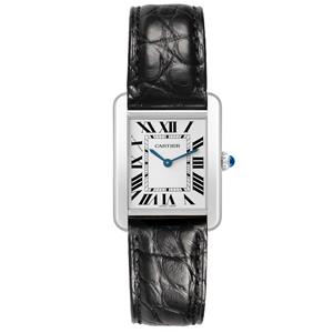Silver opaline dial with black Roman numerals. Sword shaped blued steel hands. Secret Cartier signature at X.