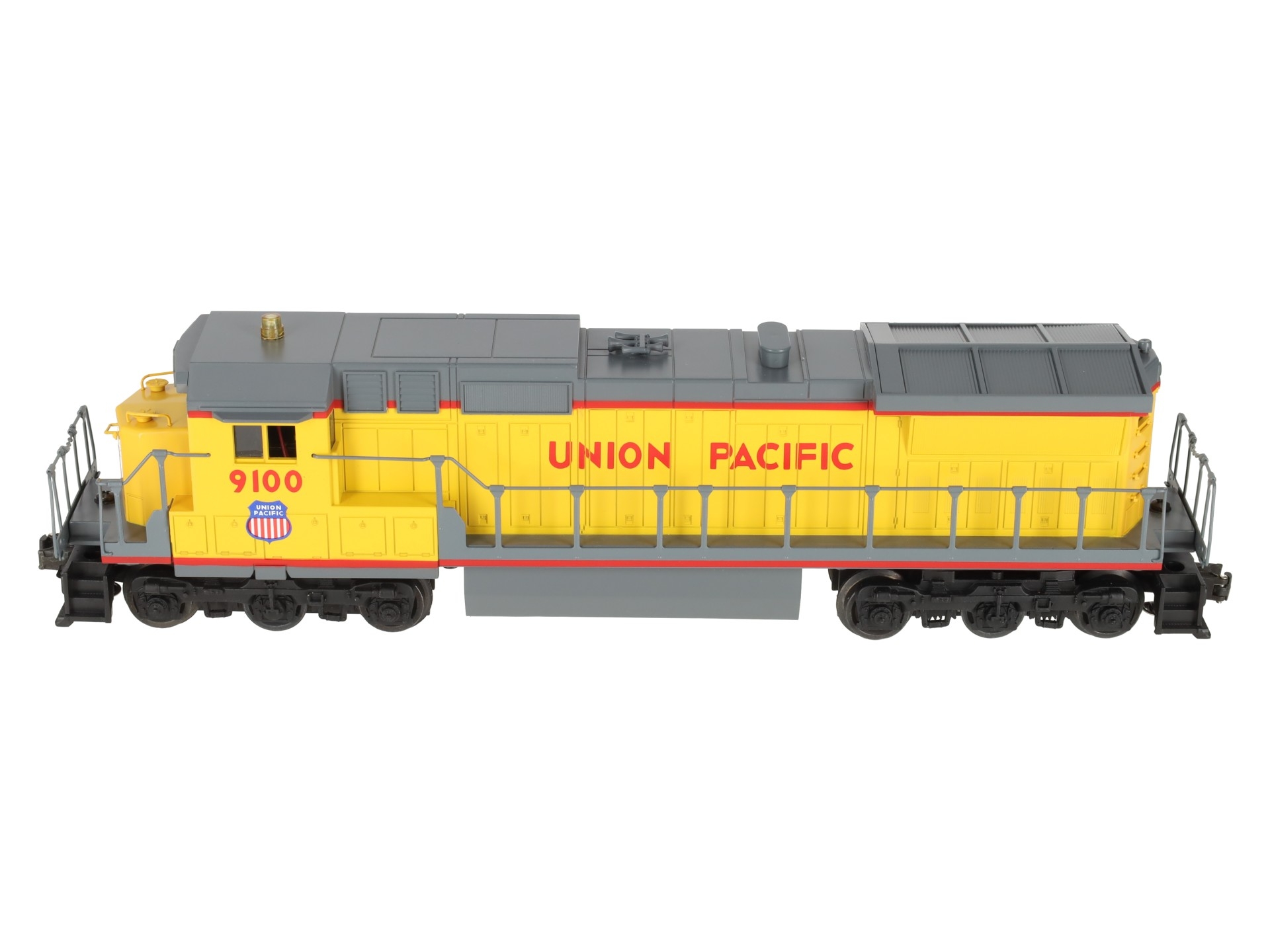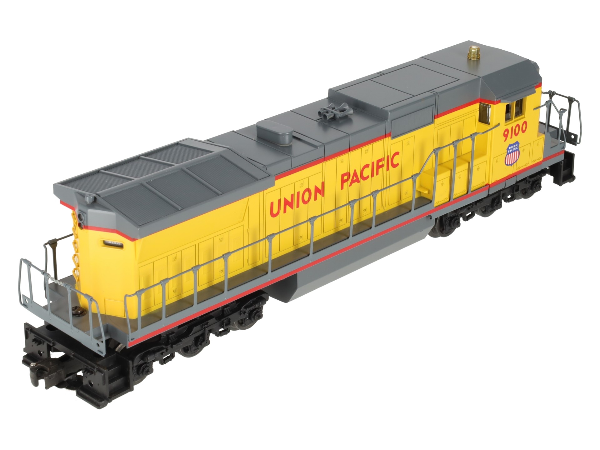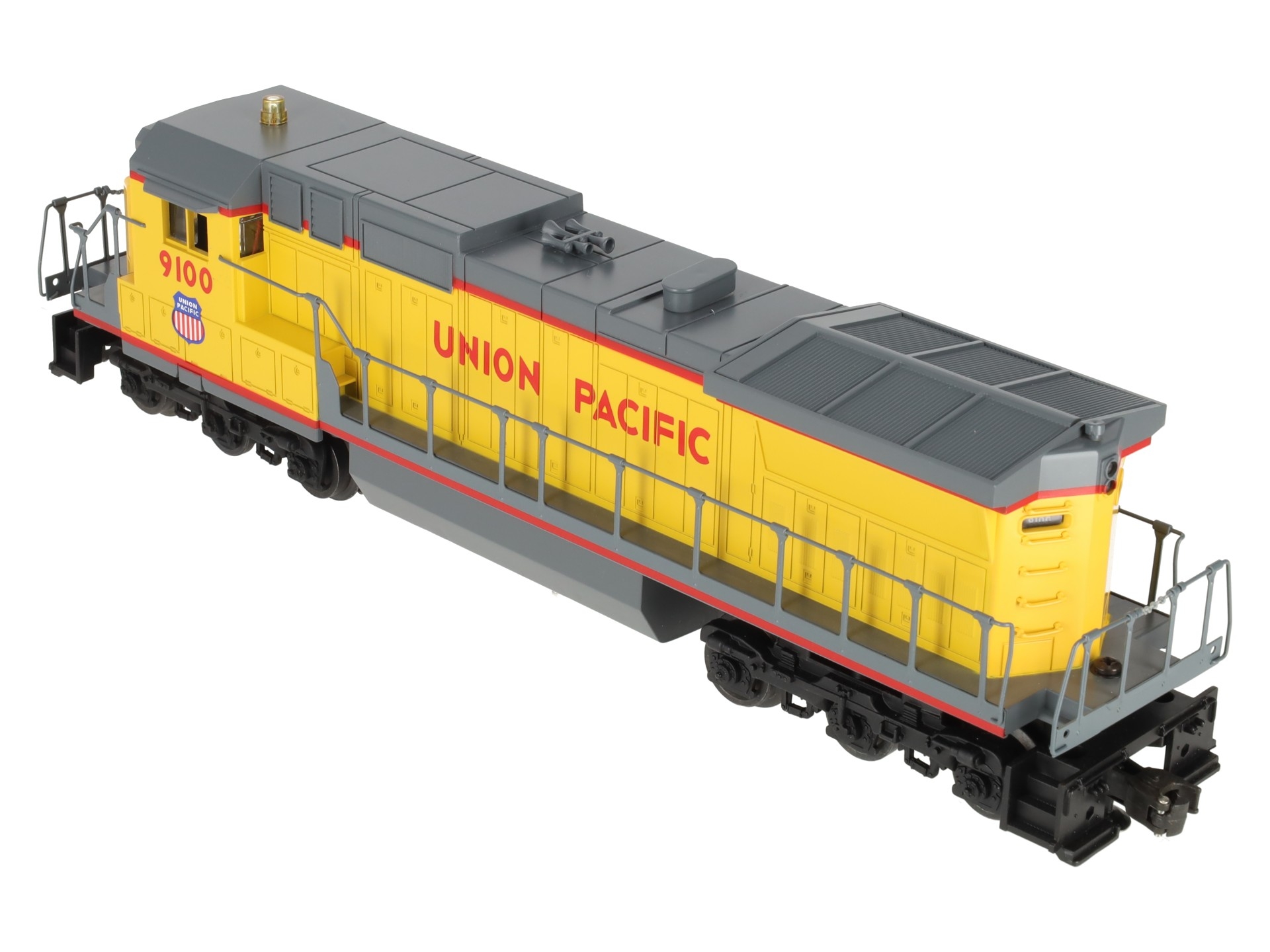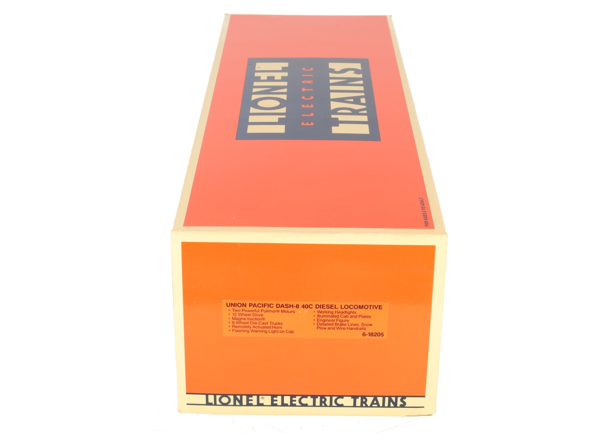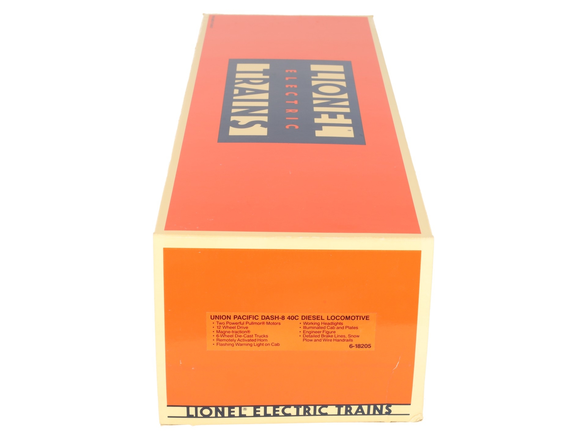 Here is a Lionel 6-18205 O Gauge Union Pacific Dash-8 40C Diesel Locomotive #9100. This is the first Dash 8-40C that Lionel produced back in 1989. Features include plastic body construction, (2) powerful dual motors, 6 wheel die-cast trucks, a flashing warning light on cab, operating knuckle couplers, and an electronic horn.