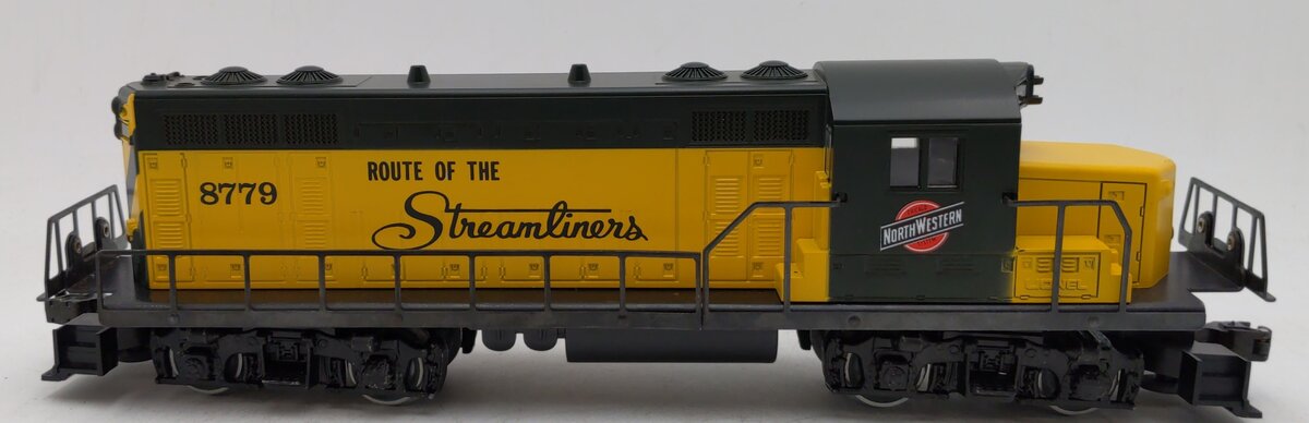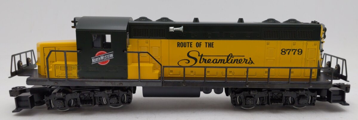 Here is a Lionel 6-8779 O Gauge Chicago and Northwestern GP-20 Non-Powered Diesel Locomotive from 1977-78. Features include die-cast metal trucks, a decorative horn, metal railings, metal wheels, and metal operating knuckle couplers.