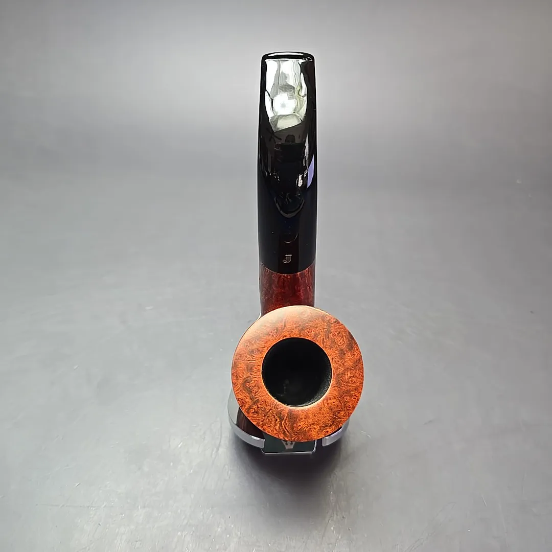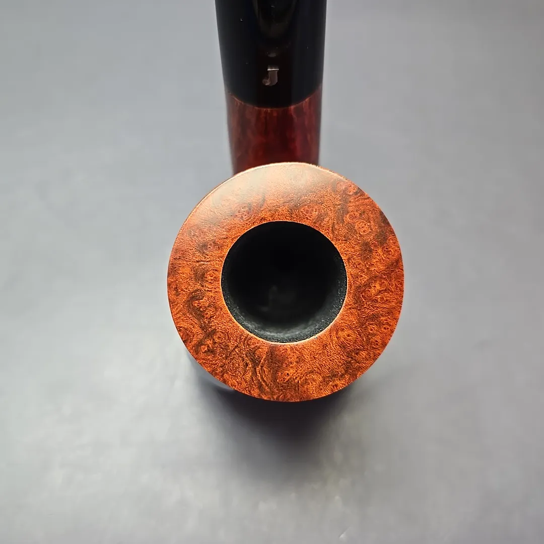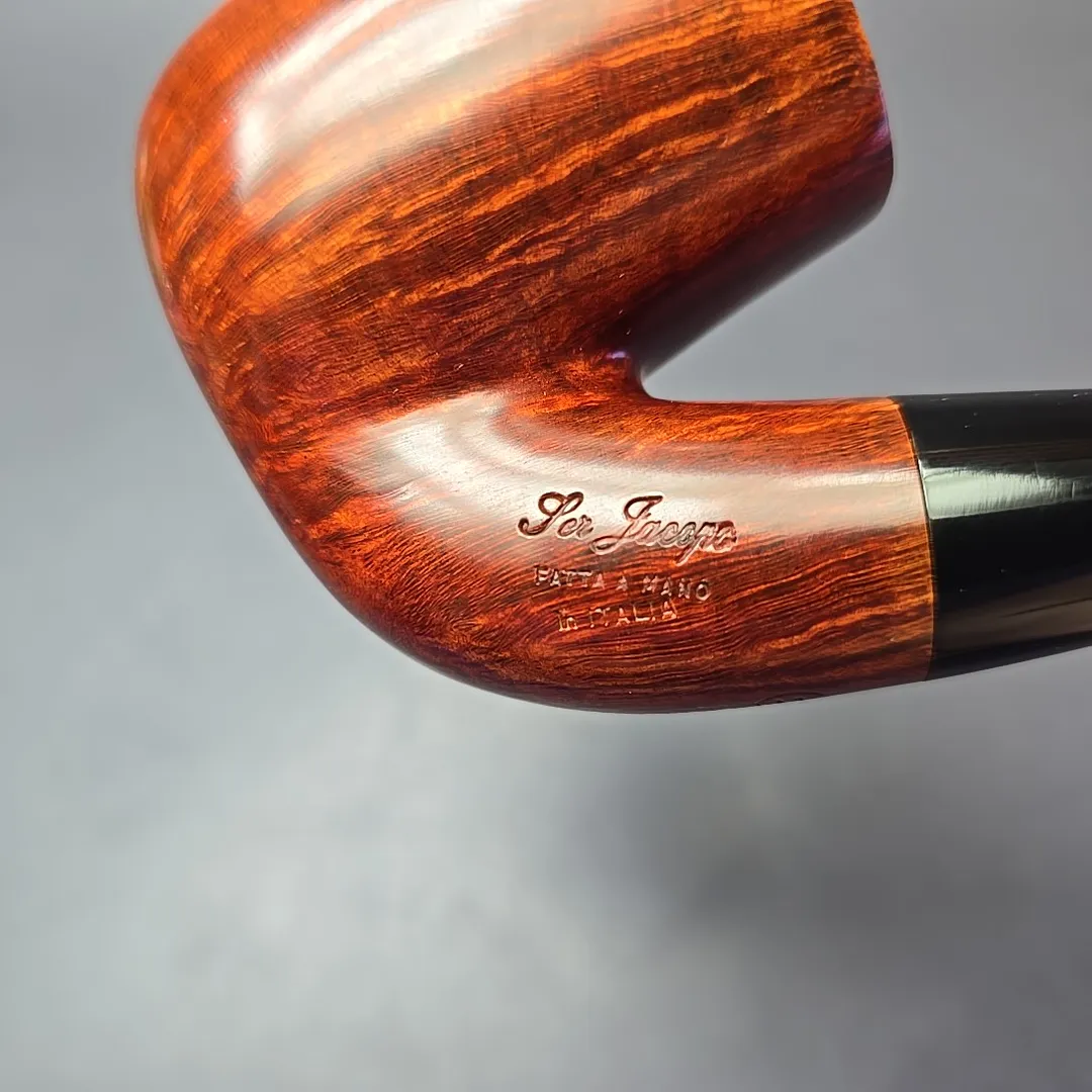 While Ser Jacopo pipes often lean toward the ornate—and sometimes, toward the downright extravagant—the workshop’s roots will likely always be in the “Pesaro school” and its classical leanings. Thus, throughout its history (and its pre-history in Mastro de Paja), Ser Jacopo has maintained a place in its portfolio for renditions of more traditional shapes. The difference, of course, is that Ser Jacopo’s “traditional” pipes express levels of precision, attention to detail, and beauty that are seldom possible outside of the artisan’s craft. This particular pipe is one of Ser Jacopo’s more traditional wares, an oversized, “Maxima” bent billiard, with exquisitely tight and consistent straight grain lining its exceedingly large bowl.