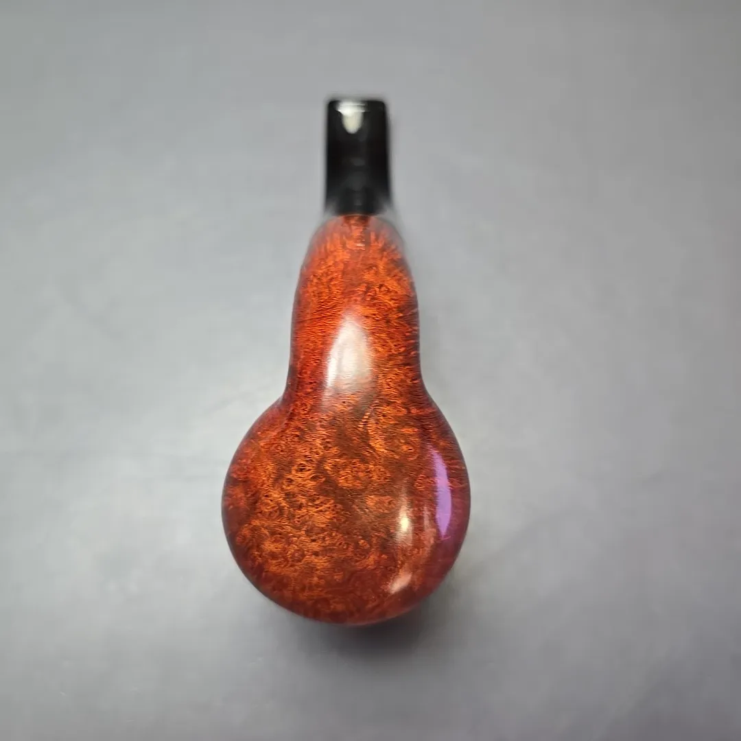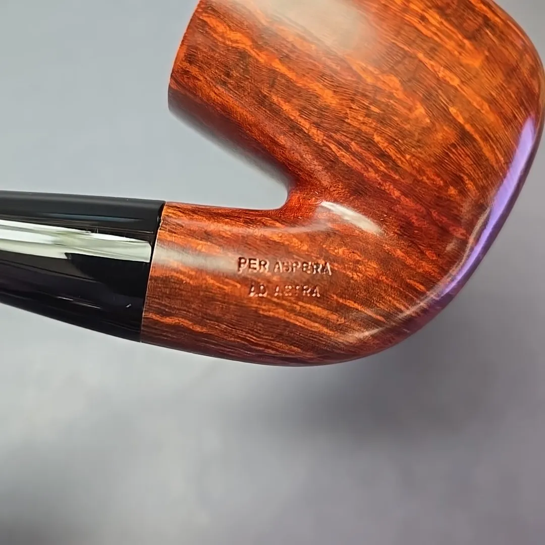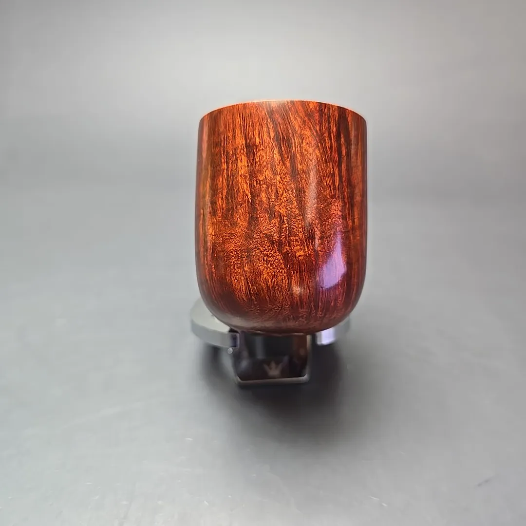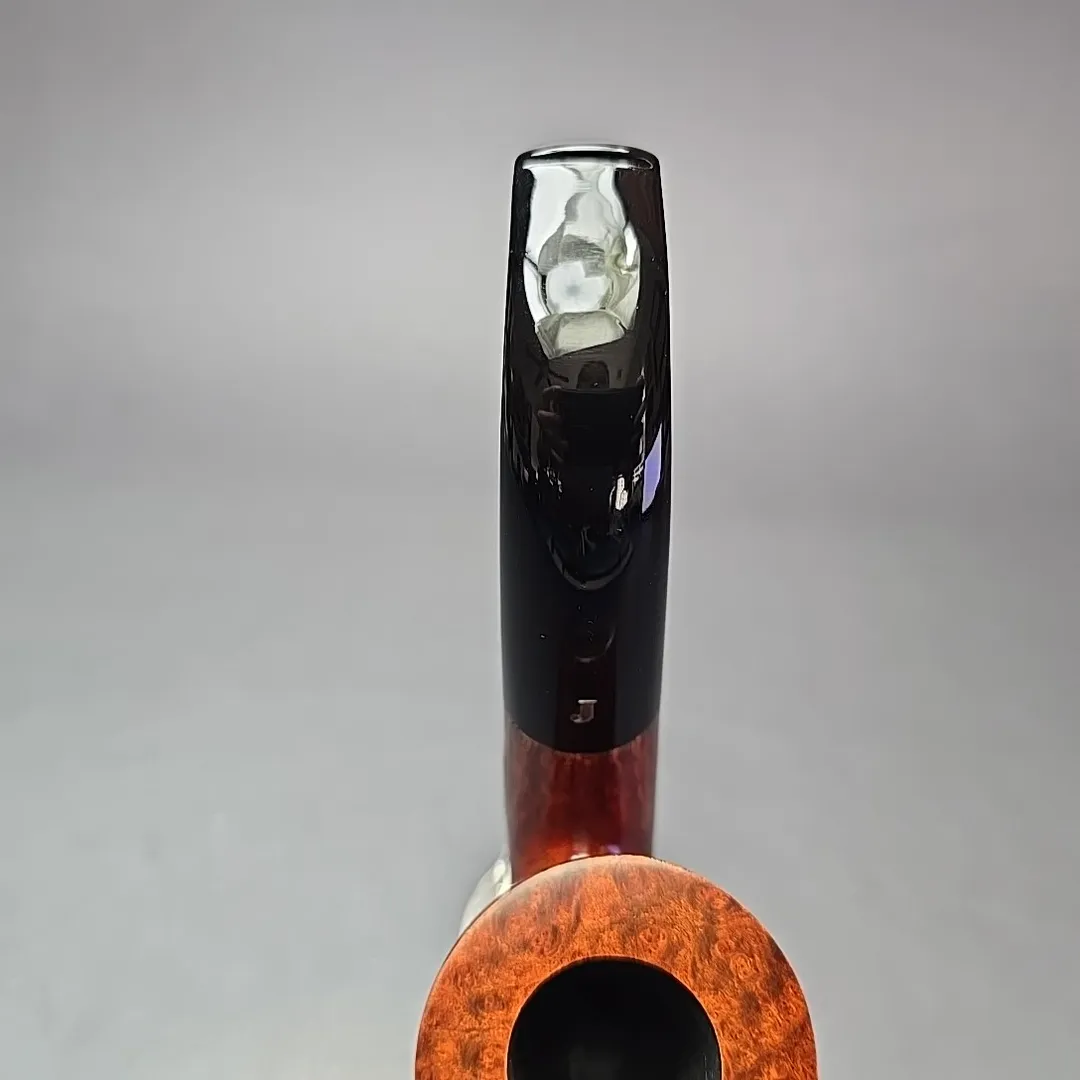 While Ser Jacopo pipes often lean toward the ornate—and sometimes, toward the downright extravagant—the workshop’s roots will likely always be in the “Pesaro school” and its classical leanings. Thus, throughout its history (and its pre-history in Mastro de Paja), Ser Jacopo has maintained a place in its portfolio for renditions of more traditional shapes. The difference, of course, is that Ser Jacopo’s “traditional” pipes express levels of precision, attention to detail, and beauty that are seldom possible outside of the artisan’s craft. This particular pipe is one of Ser Jacopo’s more traditional wares, an oversized, “Maxima” bent billiard, with exquisitely tight and consistent straight grain lining its exceedingly large bowl.