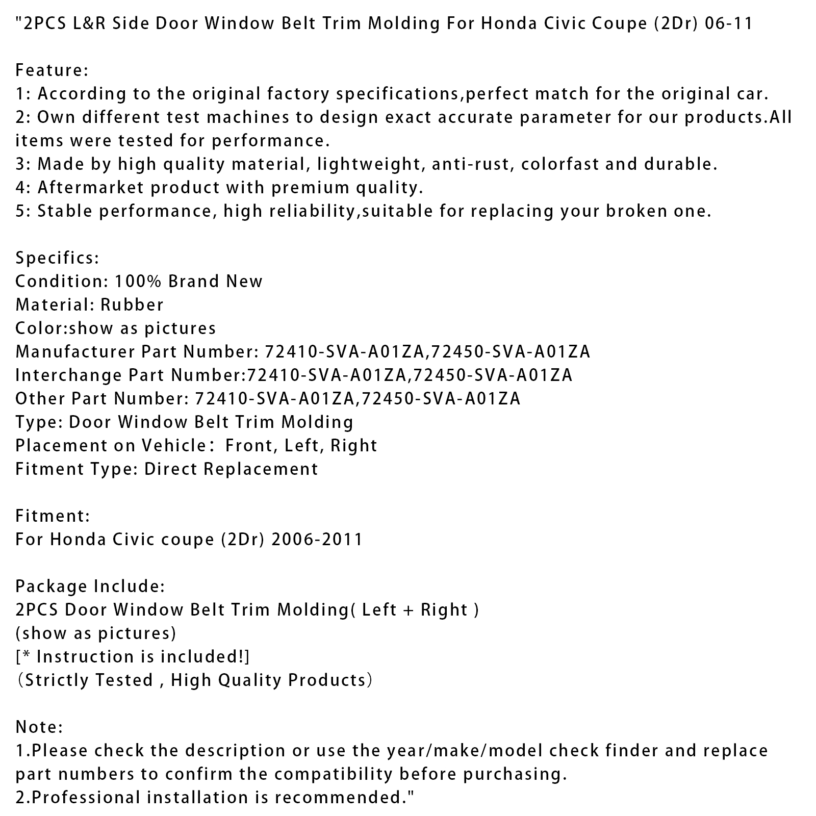 2PCS L&R Side Door Window Belt Trim Molding For Honda Civic Coupe (2Dr) 06-11