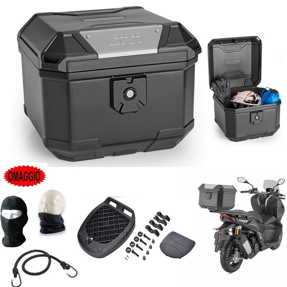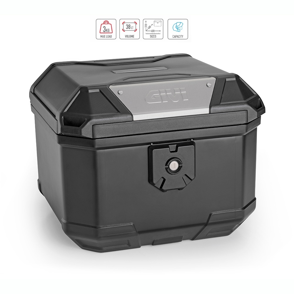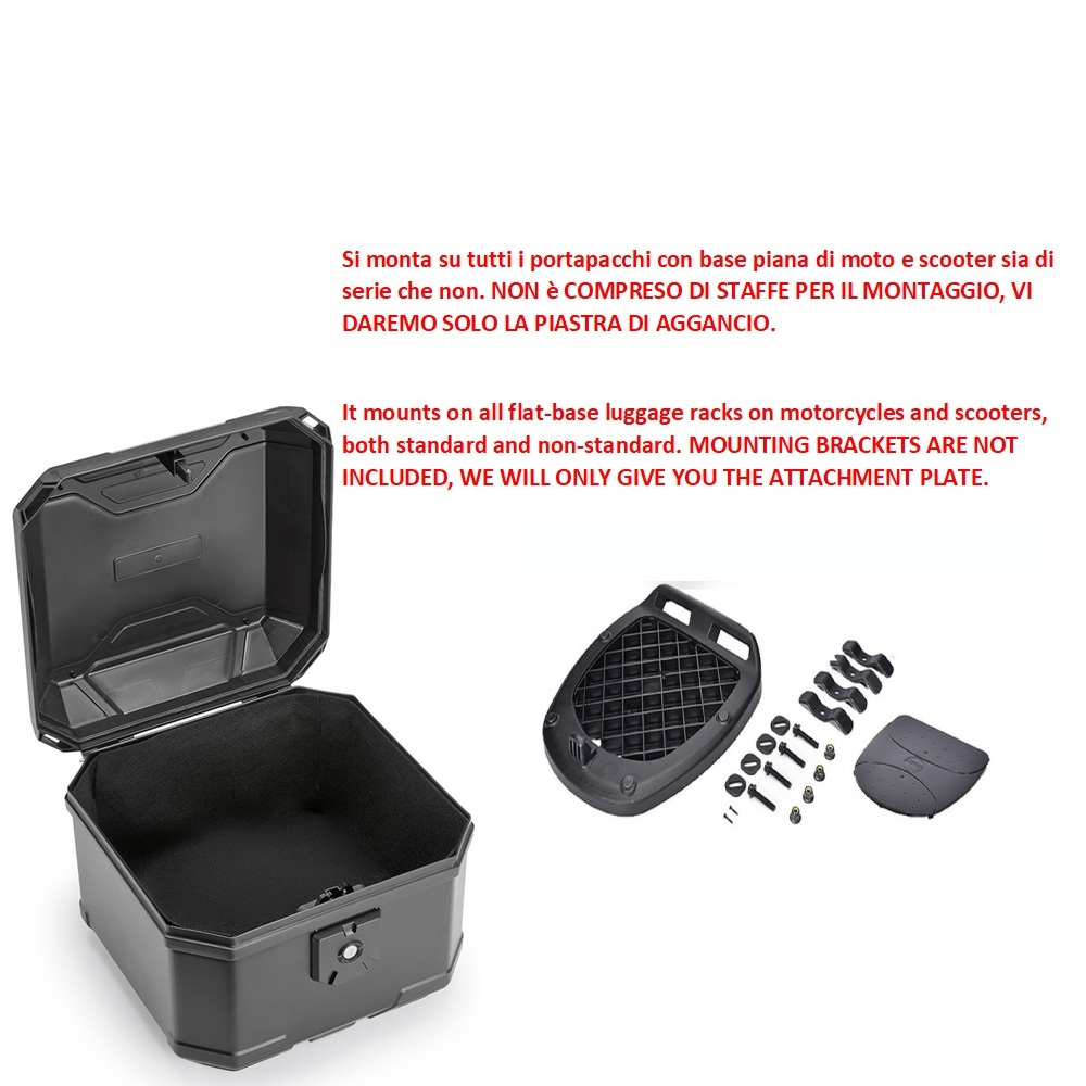 CARATTERISTICHEDESCRIZIONE DEL PRODOTTO: Bauletto MONOLOCK 38 Lt, con sistema di sgancio dall'interno. Comprensivo di piastra e kit universale. Si monta su tutti i portapacchi con base piana di moto e scooter sia di serie che non. NON è COMPRESO DI STAFFE PER IL MONTAGGIO, VI DAREMO SOLO LA PIASTRA DI AGGANCIO MONOLOCK, PER PORTAPACCHI POSTERIORE O STAFFE -Max Load 3 Kg -Volume 38 lt -Sizes 310mm x 400mm x 400mm -Capacità 1 casco modulare. -Colore nero. Il Bernina è il nuovo bauletto Monolock pensato per chi desidera stile, resistenza e praticità in un unico prodotto. Realizzato in tecnopolimero ad alta resistenza con finitura in alluminio, unisce solidità e raffinatezza estetica, adattandosi perfettamente sia a moto che scooter. Il design degli angolari dona una linea più moderna e dinamica, mantenendo rigidità e robustezza strutturale. All’interno, il rivestimento in feltro offre una protezione efficace del contenuto da urti e graffi, mentre la capienza consente di custodire un casco modulare taglia XXL. Fornito completo di piastra e kit di fissaggio, il Bernina si distingue per la facilità di montaggio e la qualità delle soluzioni tecniche. Il sistema di chiusura Crablock, abbinato al pomello a stella posto sul fondo, consente di sganciare il bauletto dalla piastra in modo rapido e controllato. La rimozione è possibile solo a coperchio aperto, garantendo un elevato livello di sicurezza e prevenendo sganci accidentali. Il Bernina rappresenta la perfetta sintesi tra design attuale, solidità e funzionalità, un accessorio pensato per chi affronta ogni viaggio con stile e sicurezza. GIV I garantisce per le proprie valigie un grado di tenuta acqua corrispondente a una normale pioggia, in particolare le valigie vengono testate con un apposito macchinario che simula una pioggia con una portata maggiore di 20 lt./ min.
