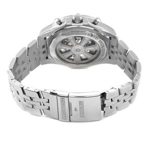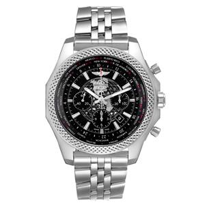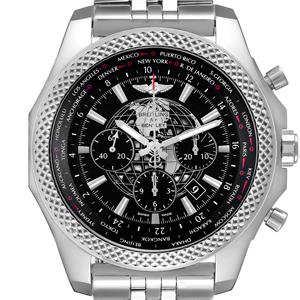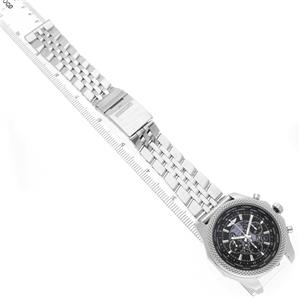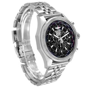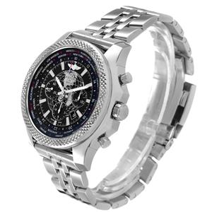 Royal Ebony black dial. Luminescent stainless steel outlined hands. Globe design with longitude & latitude lines in the middle of the dial.World time around the outer rim. Date calendar window between 4 and 5. Three stepped-down stell outlined chronograph sub-dials -- 60 second, 30 minute and 12 hour. Large red tipped central seconds hand with the contrwaight Breitling logo. |