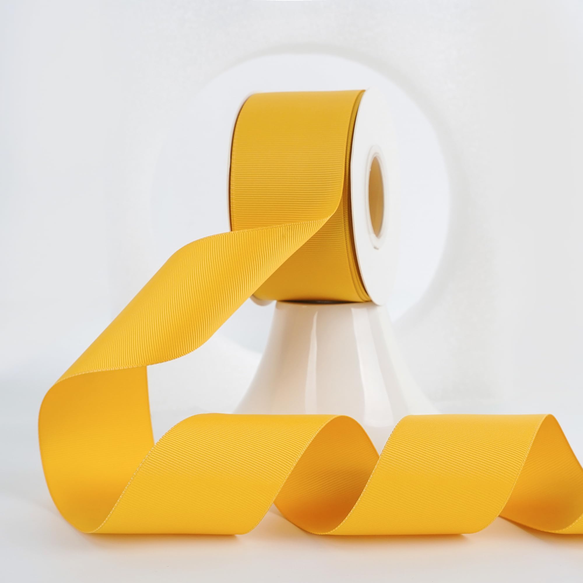 - Solid yellow color grosgrain ribbon. Made from high-quality polyester material that is strong and long-lasting, making it perfect for all your crafting and decorating projects. This 2-inch woven grosgrain ribbon has a beautiful sheen, vibrant color, and the perfect consistency for shaping hair bows as well as other craft projects: it is sturdy, but not too stiff! Use it for all your gift wrapping and crafting needs for a touch of elegance.