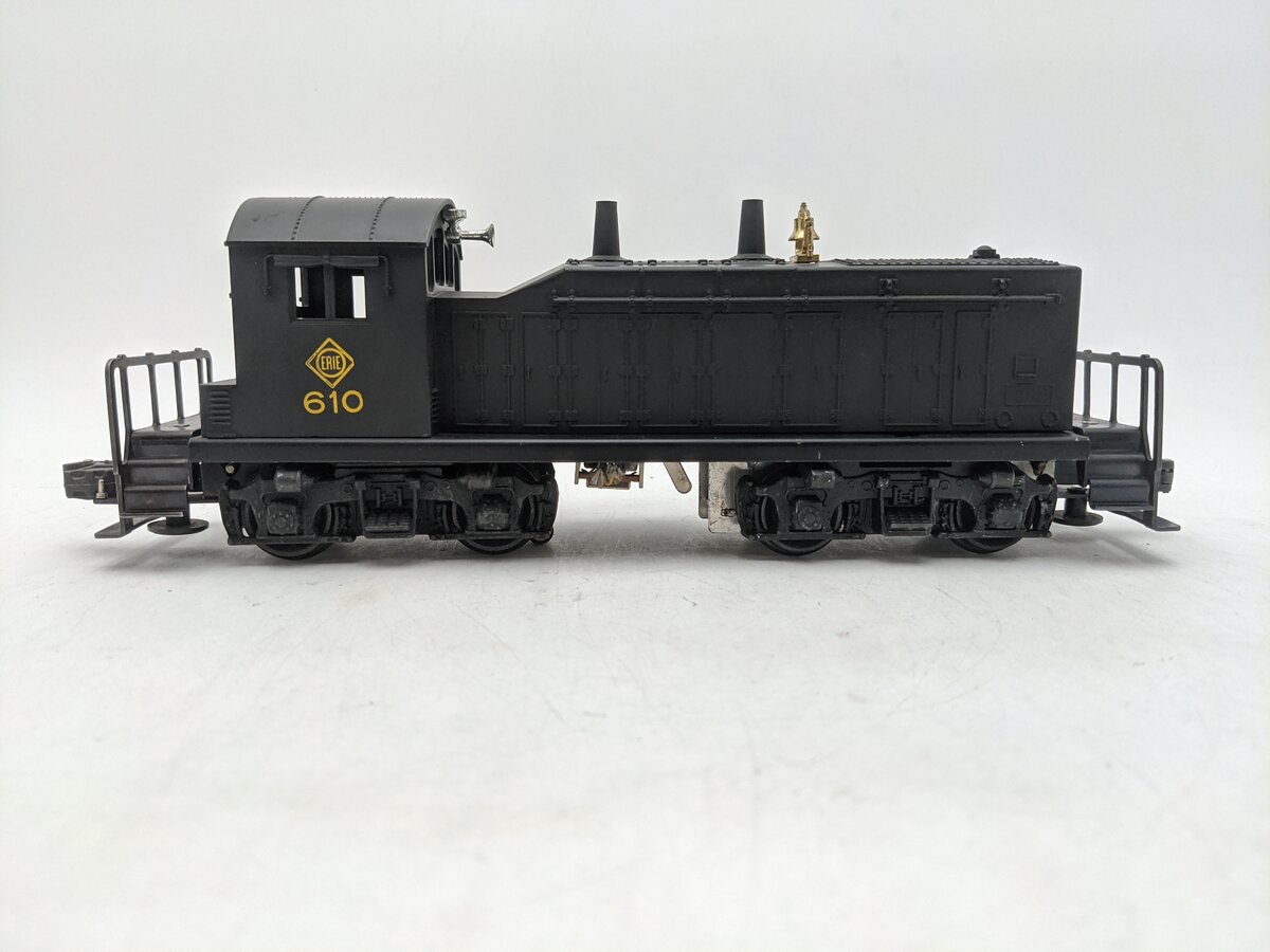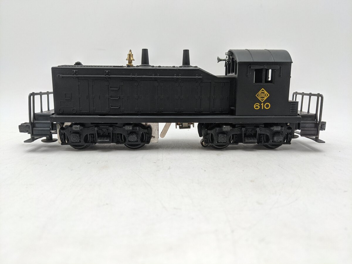 This is a powered Lionel 610 Vintage O Erie NW-2 Powered Diesel Switcher Locomotive #610 from 1955. This diesel locomotive features a powerful motor, reverse unit, die-cast operating knuckle couplers, die-cast metal trucks and metal wheels and axles.