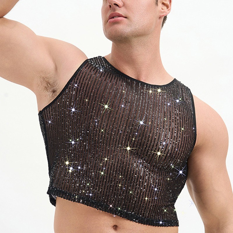 Men Crop Tank Sheer Mesh Shirts Costume See Through Vest Muscle Rave Party Sexy