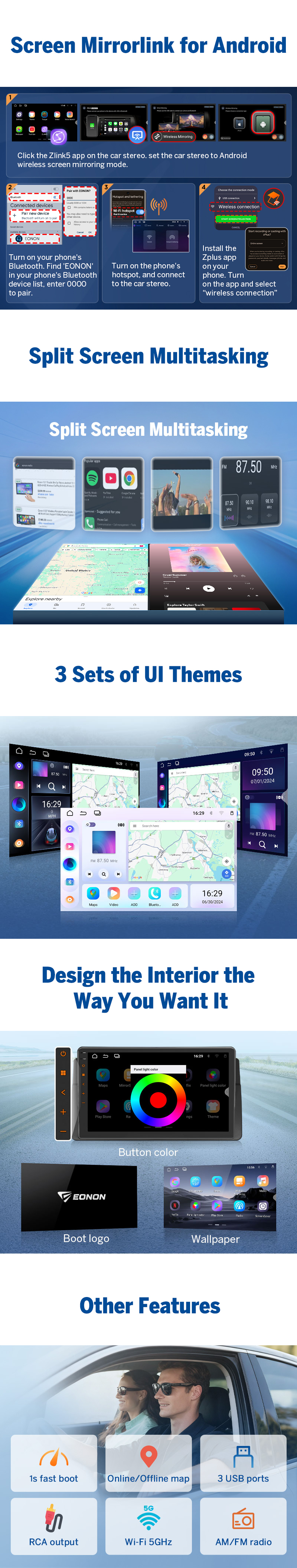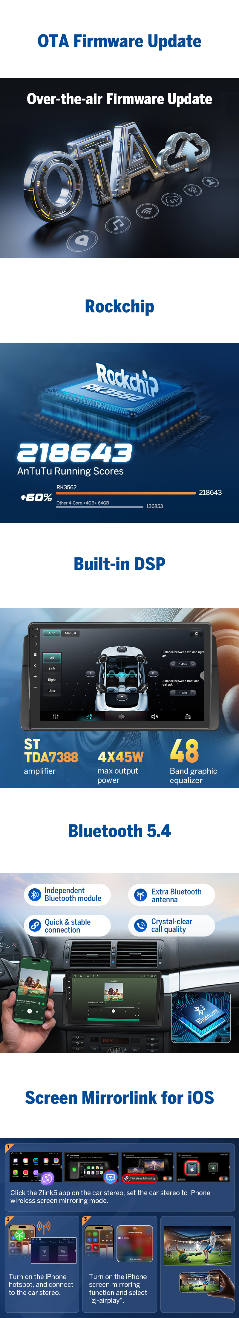 4 GB RAM + 64 GB ROM | Wireless Apple CarPlay & Android Auto | 9" IPS HD Touchscreen | DSP Autoradio | Integriertes GPS | WiFi 6 | Bluetooth 5.4 | OTA-Updates
