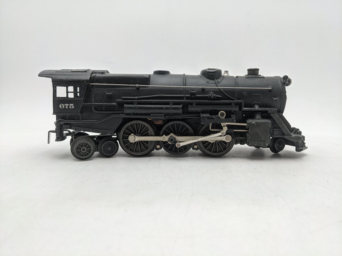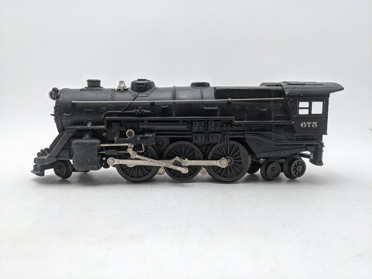 Here is a Lionel 675 Vintage O 2-6-2 K-4 Pacific Die-Cast Steam Locomotive. This locomotive features a die-cast boiler shell, a three position forward-neutral-reverse remote control E-unit, operating puffing smoke, an operating headlight, an aluminum smokestack, Baldwin disc drive wheels, die-cast trailing truck and an ornamental bell.