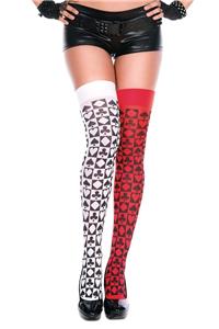 - Description: Opaque two-tone thigh high stockings feature an an all over card suit design. Bottoms not included.