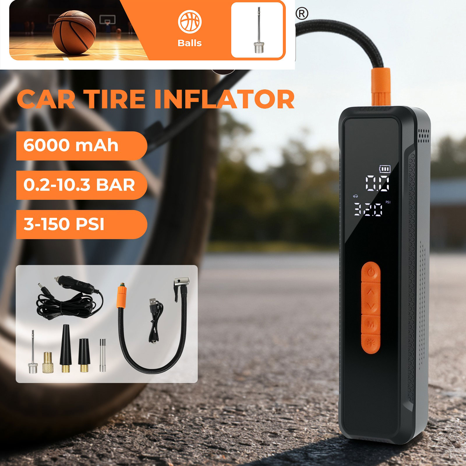 【Long Battery Life】The powerful 6000mAh battery can inflate 3-4 car tires on a single charge. The included 12V DC power connection ensures continuous power – always ready to use!