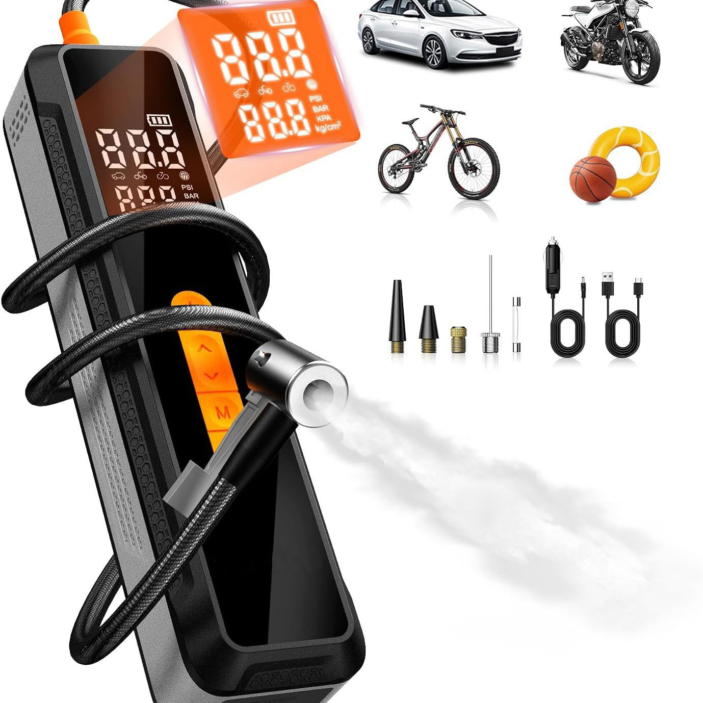 【Multiple Inflation Modes】This portable compressor features 4+N intelligent modes, perfect for cars, bicycles, motorcycles, and sports balls. Simply set the desired pressure – the pump automatically stops once reached.
