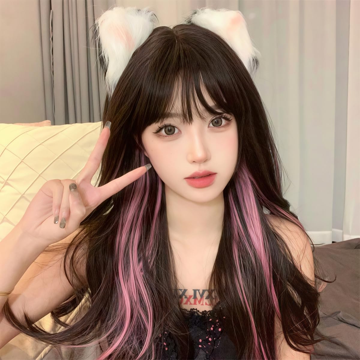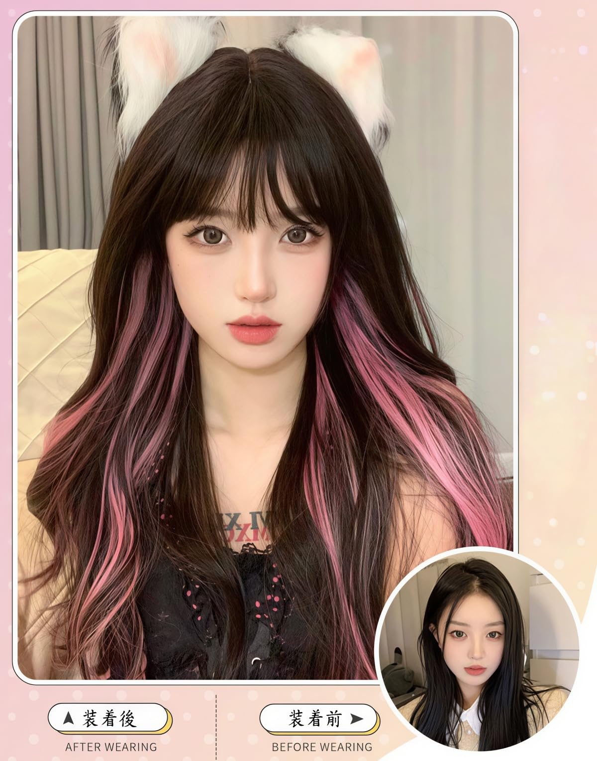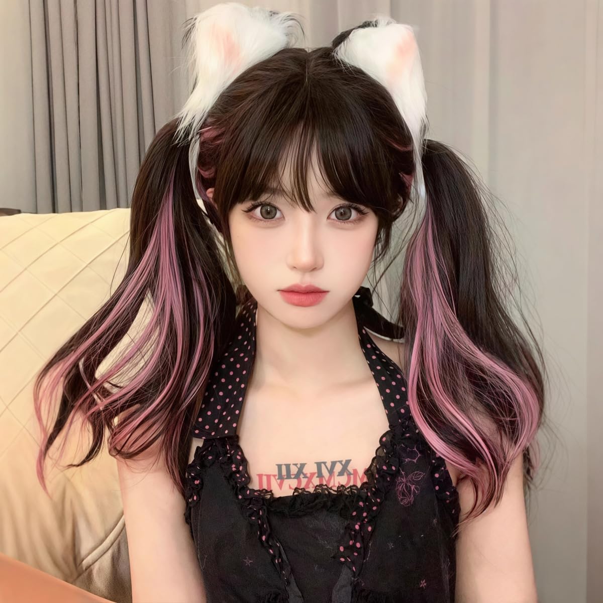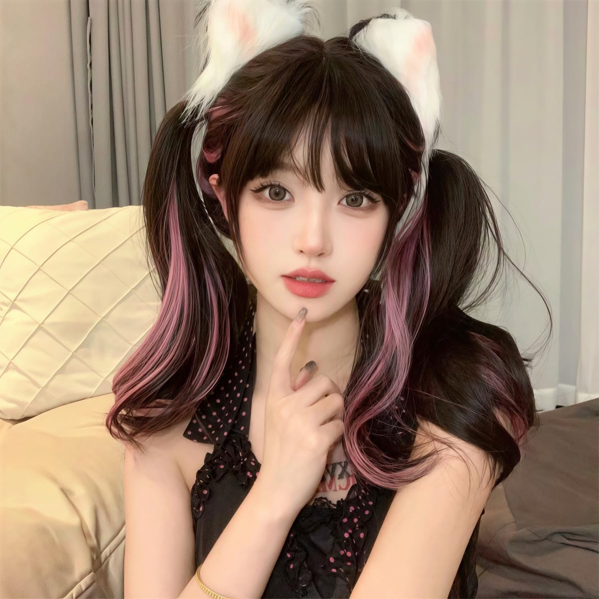Ryuucos Lolita Wig, Long Hair, Twin Tails, Black, Brown, Pink Highlights, Haraj_