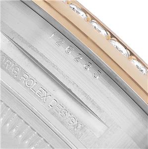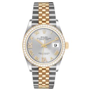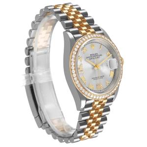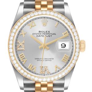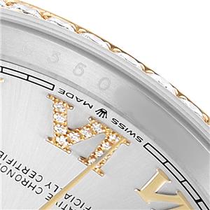 Silver dial with raised yellow gold Roman numerals. Original Rolex factory diamond set Roman numerals at 6 and 9 o'clock. Date calendar at 3 o'clock aperture. |