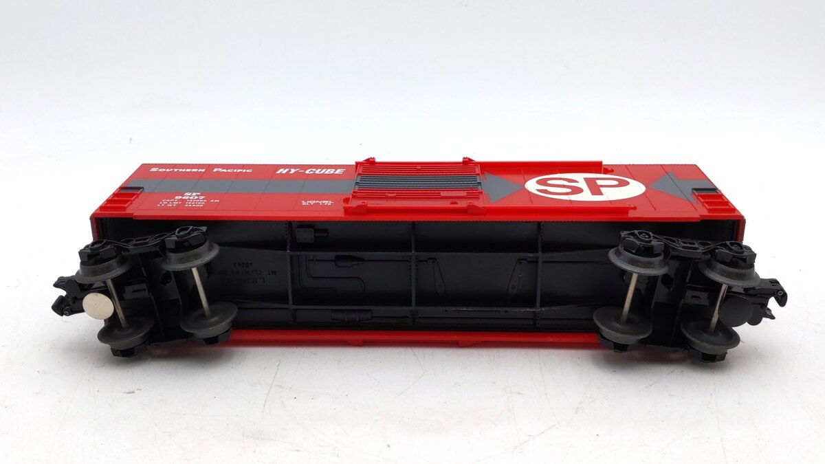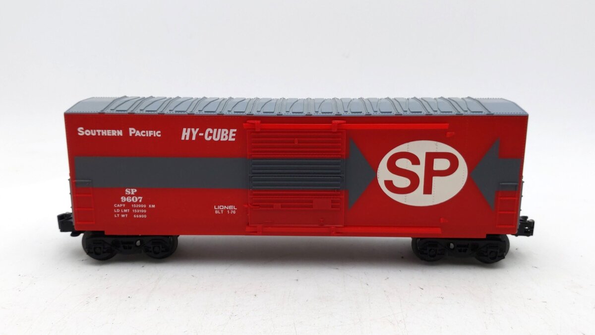 Here is a Lionel 6-9607 O Gauge Southern Pacific Hi-Cube Boxcar. This boxcar features sliding doors, plastic trucks, operating knuckle couplers, metal wheels and axles.