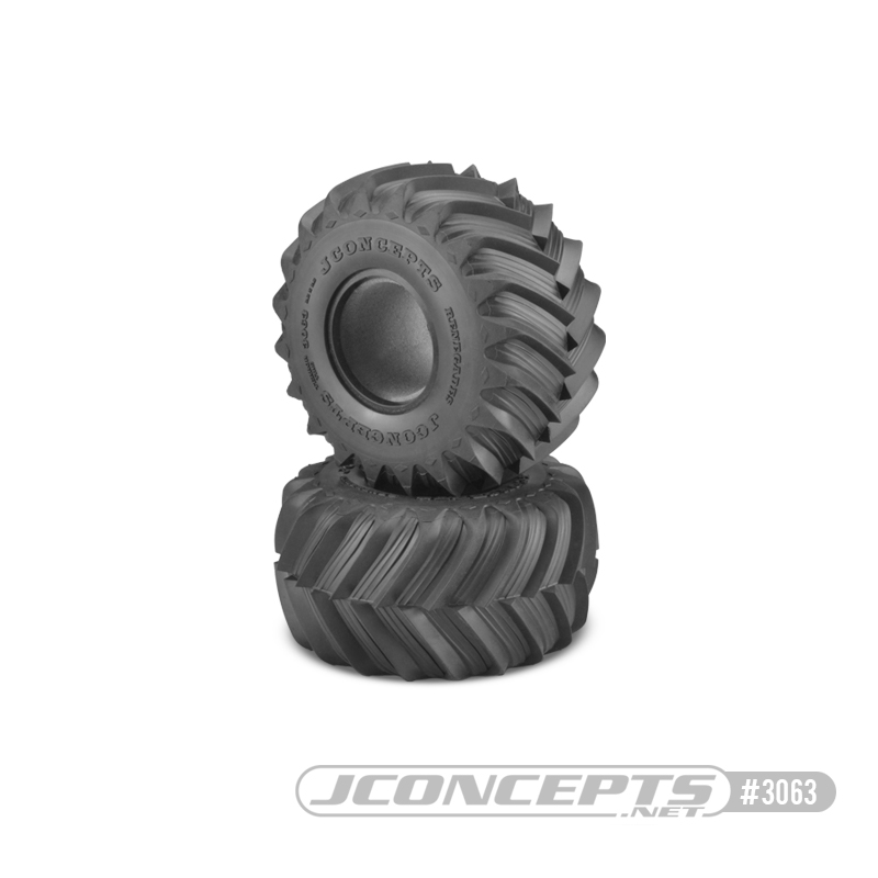 Reaching the top step on the podium is a complete racing package. The result requires the correct setup, stellar driving and just as important, a performance-built tire and compound. During the glory days of monster truck racing, cut tread became a popular method of reducing weight or altering a pattern to tune to specific track conditions. The Renegades Jr 2.2 tire by JConcepts represents the low-profile carcass and cut-tread movement, capable of winning results straight out of the package. The chevron style lugs has been created with specially designed back-cut tread and shaved carcass areas imitating the real thing. At rotation, the tread still stands tall and provides a hefty edge of forward grip in a variety of conditions. The back-cut section provides a small transition during high-speed cornering which conform to changing terrain and obstacles. The sidewalls have been treated with wording, designs and descriptions consistent with 1:1 tires during that generation of performance. The low-profile stance of the Renegades stays very flat during racecourse competition, speed-runs or general use. The tire carcass profile holds the weight extremely low while the design of the tire beads allows just the right amount of contact patch for gluing and application. The Renegades measure in at 5.50 x 2.5 x 2.2” and are available in two different compounds and fit directly to the #3380 Midwest wheels. The soft "blue" compound which is recommended for dirt, grass and asphalt feels noticeably mushy and sticky and has expanding characteristics like off-road racing outdoor compounds. The "gold" compound feels harder to the touch and excels on carpet, AstroTurf and polished concrete surfaces and expands less during high speeds. Renegades tires are complete and include open cell "React" inserts to support the grippy tires. The Renegades Jr is specifically designed to work with vehicles such as the Traxxas Stampede, Rustler, SMT10 and 2.2” based monster trucks in conjunction with JConcepts #3380 Midwest wheels.