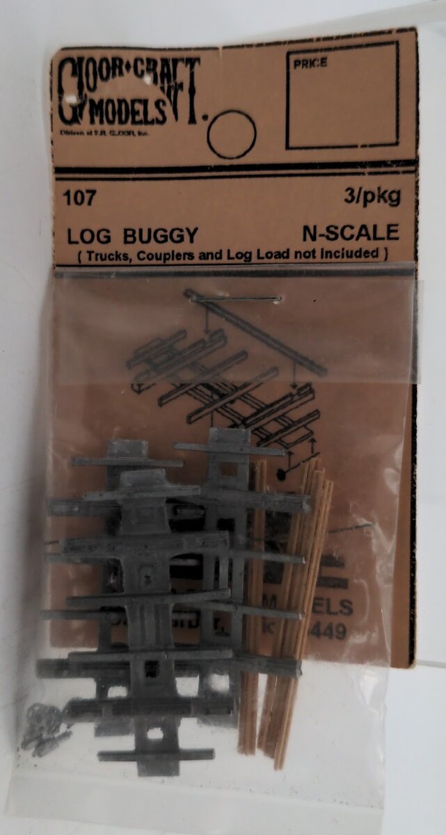 This is a Gloor Craft 107 N Scale Log Buggies Metal and Wood Kit.(Pack of 3).
