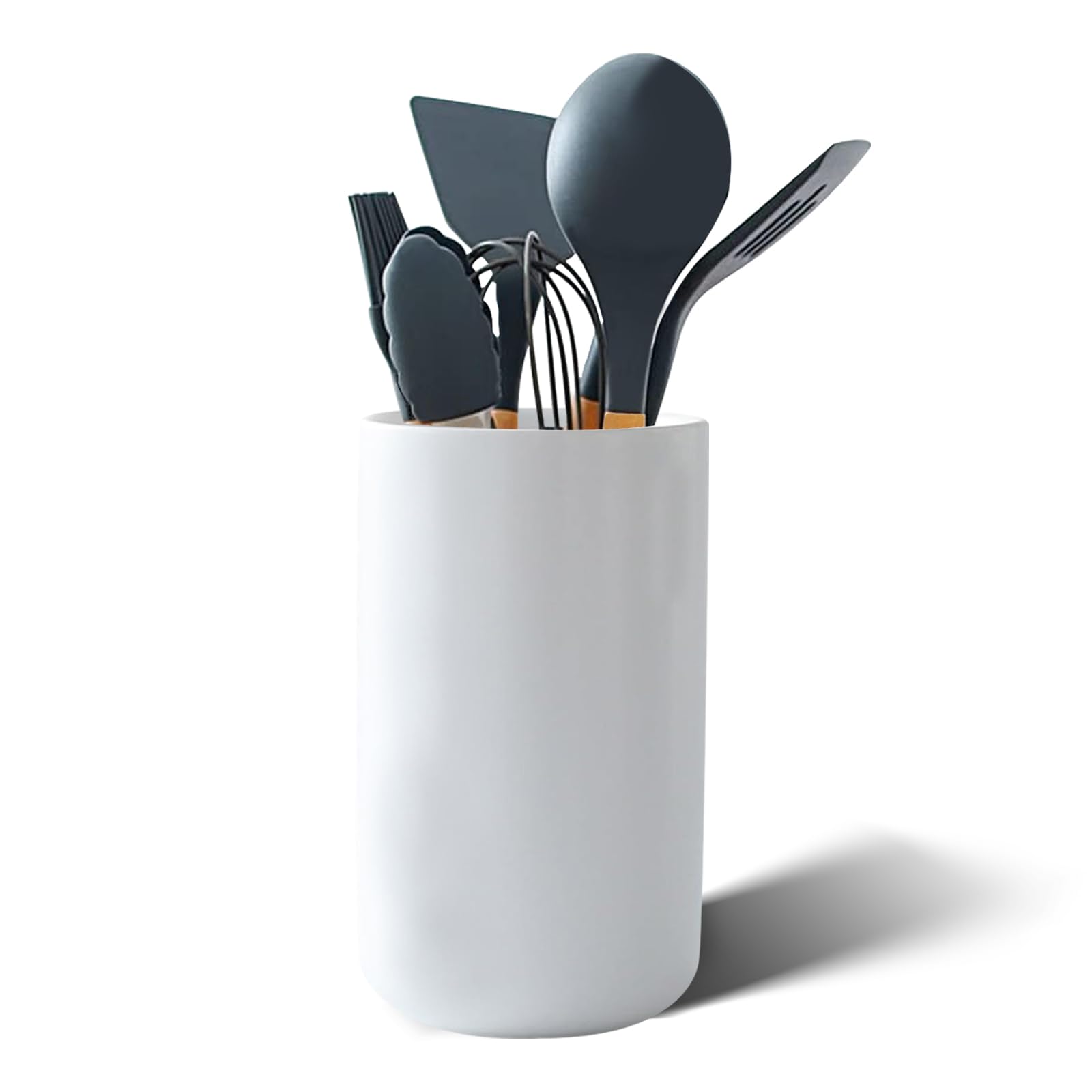 - Utensil caddy offers easy access to spatulas, ladles, and more. The ceramic kitchen utensil holder complements any decor, from look-alike to minimalist white designs
