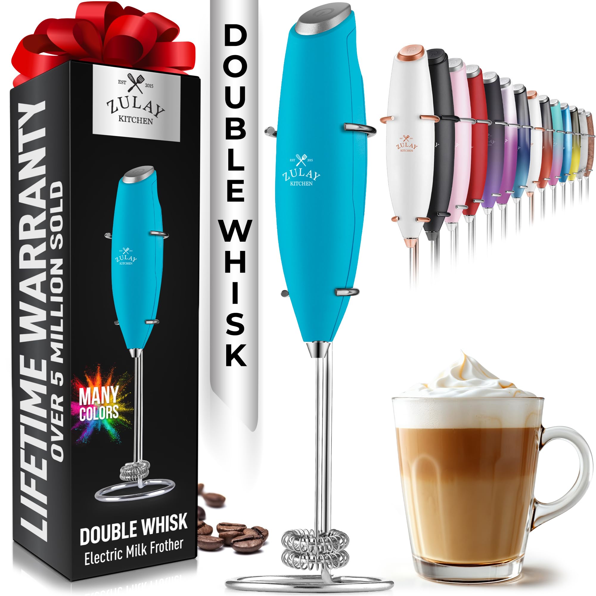 Zulay Double Whisk Milk Frother Handheld Mixer - High Whisk, Blue Teal