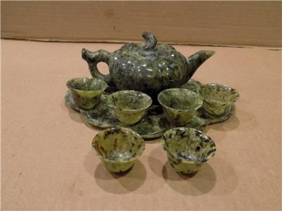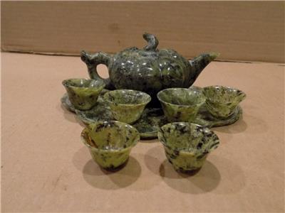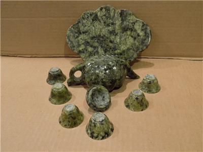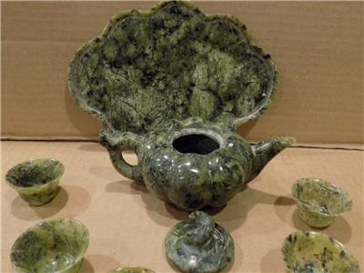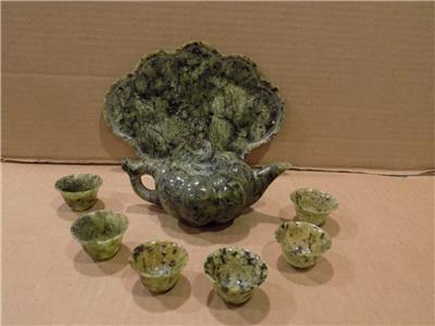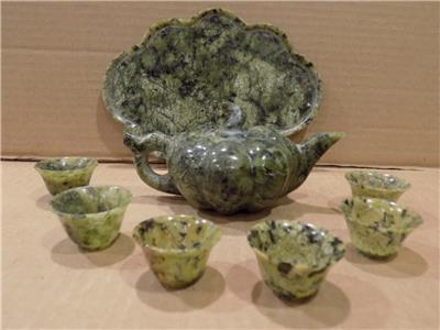 Chinese Spinach Jade Miniature Tea Set Teapot, Tray & 6 Cups Hand Made