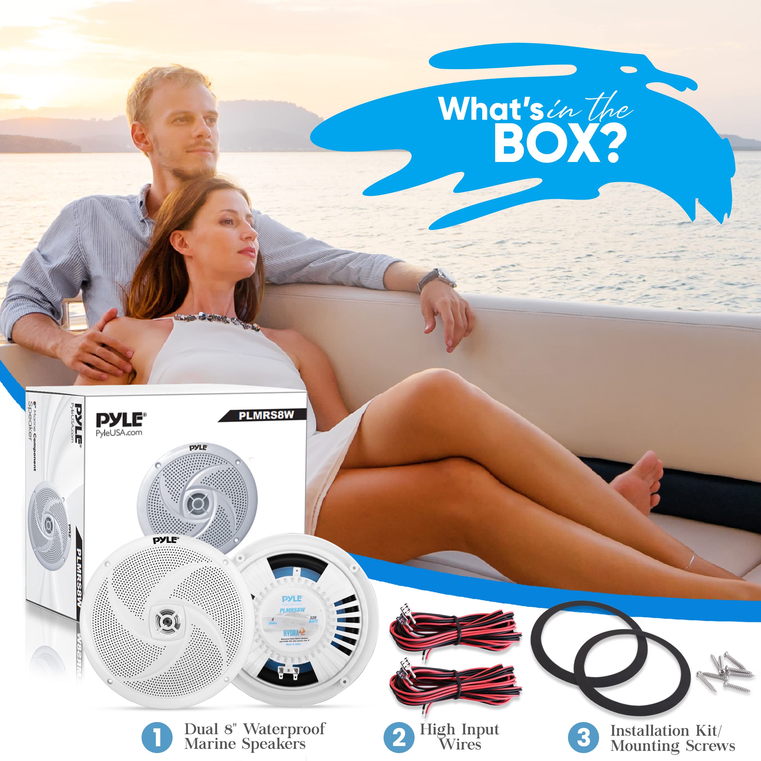 Pyle PLMRS8W 8'' 320 Watt Max Power Low Profile 2-Way Marine Speakers (White, Pair) (x2)