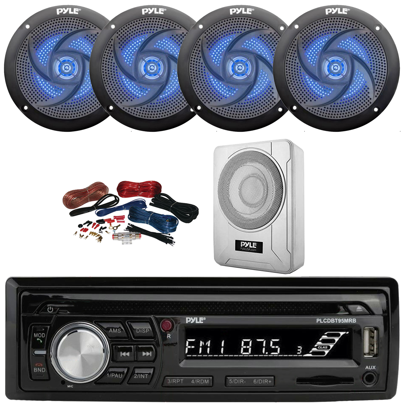 Pyle PLCDBT95 Single DIN Marine Bluetooth USB/AUX MP3/CD Player AM/FM Radio In Dash Stereo Receiver, 4x 4" 100W Max Low Profile Blue Flashing LED Speakers, 8” 600W Max Under-Seat Subwoofer W/Kit