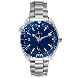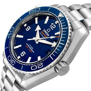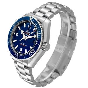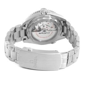 Stainless steel round case 43.5 mm in diameter. Helium escape valve at 10 o'clock. Transparent exhibition sapphire crystal case back. Omega logo on the crown. |