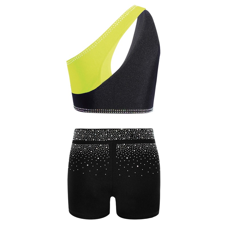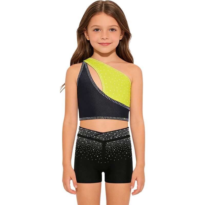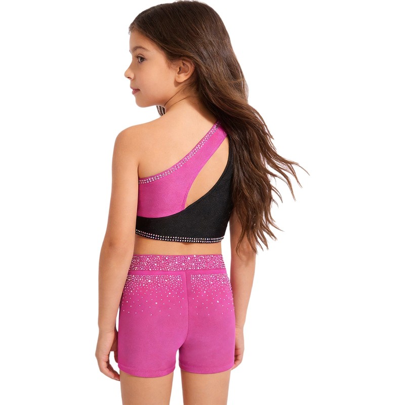 The sparkling rhinestones on the top and shorts create a dazzling effect, making the girl stand out in the spotlight and enhancing her charm.