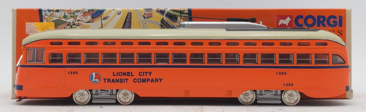 This is a Lionel 55004 O P.C.C. Lionel City Transit Corp Street Car Trolley #1250 by Corgi. It features durable die-cast construction, metal wheels, and metal axles. It is not powered.