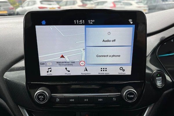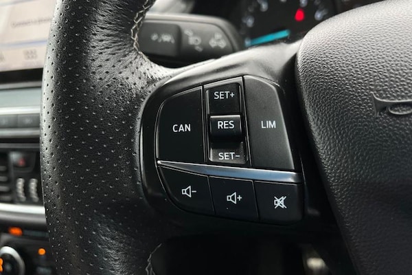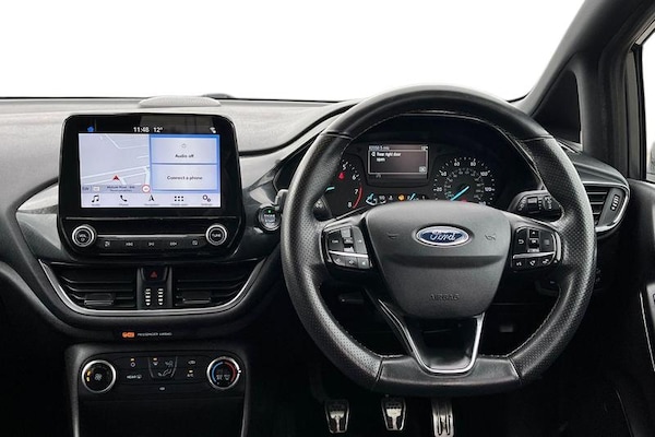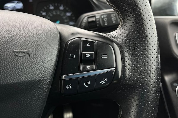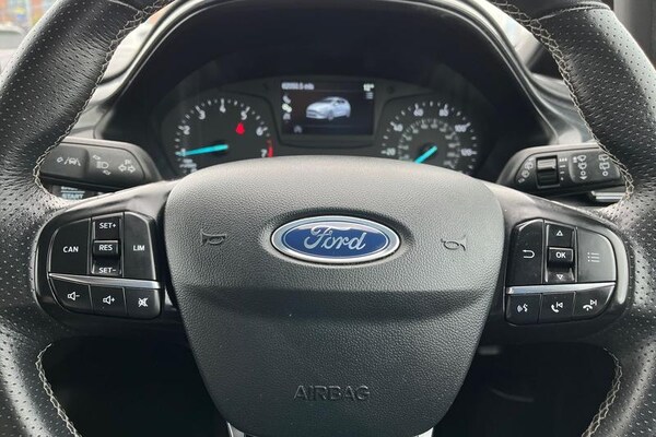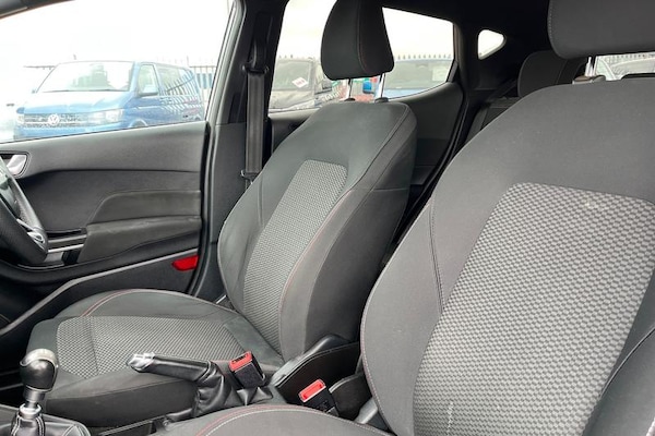 Bluetooth system, Electric power steering, Ford easy fuel, Trip computer, Body colour bumpers, Body colour door handles, Body colour large rear spoiler, Chrome door handles, Chrome lower window surround, Cornering front fog lights, Electric front windows/one touch facility, Privacy glass, Quickclear heated windscreen, Rear wiper, Rugged body styling kit with active front wing badges, Tinted glass, Unique ST-Line upper grille & full bodystyling kit with ST-Line wing badges, 12V Accessory socket in centre console, 3 spoke flat bottomed leather steering wheel, 60/40 split folding rear seat, Adjustable head restraints, Black headlining, Boot carpet, Centre console with armrest and illuminated cupholders, Chrome inner door handles, Cloth upholstery, Footwell illumination, Front and rear velour floor mats, Front map reading lights, Front seat and rear pockets, Height adjustable driver's seat, Illuminated glovebox, Leather gear knob, Leather trimmed handbrake handle, Load area light, Manual air conditioning, Overhead console with sunglasses holder, Pollen filter, Rake/reach adjustable steering wheel, Rear centre head restraint, Sports front seats, Sports pedals, 3 point seatbelts on all rear seats, ABS+EBA, Curtain airbags, Driver and passenger airbags, Drivers knee airbag, Electronic stability control with hill start assist, Front passenger airbag deactivation, Front side airbags, Seatbelt warning, Tyre pressure monitoring system