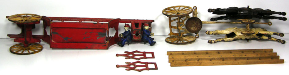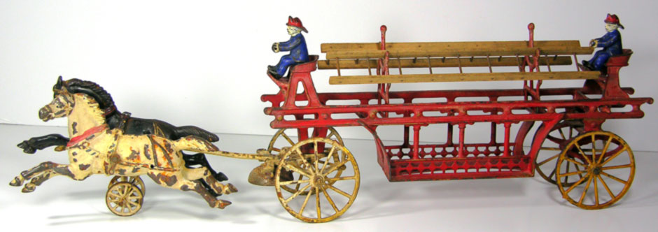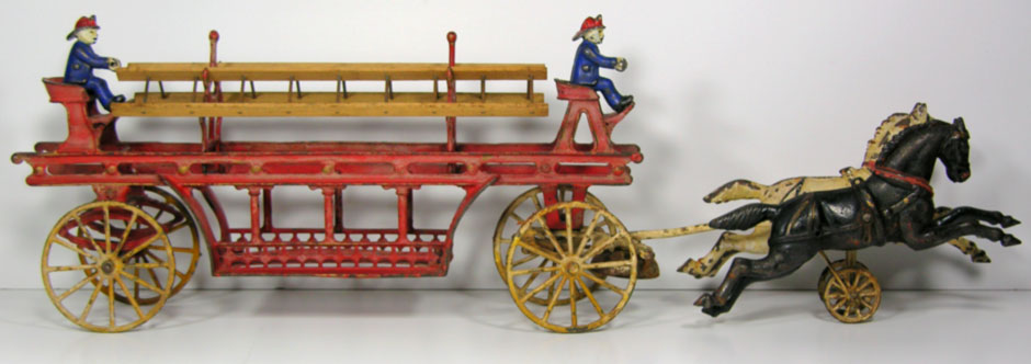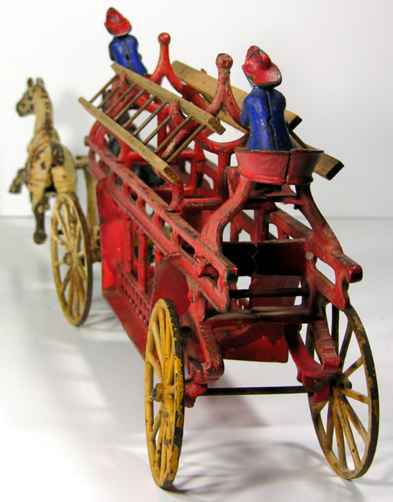 Founded in 1890 the Kenton Lock Manufacturing Co. began producing toys in 1894 with a line of horse-drawn fire equipment, banks, and toy stoves. We have been told that the Ladder Wagon / Fire Truck offered here was one of the earliest Toys manufactured by the company. Renamed Kenton Hardware in 1900, the company became part of mammoth the National Novelty Corp. merger in 1903 and continued its toy line under the name Wing Mfg. Co. Involved in several unsuccessful takeovers, Kenton eventually emerged as a separate unit, the Kenton Hardware Co., and again produced toys successfully from 1920-1935.