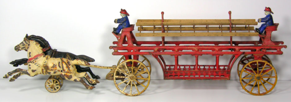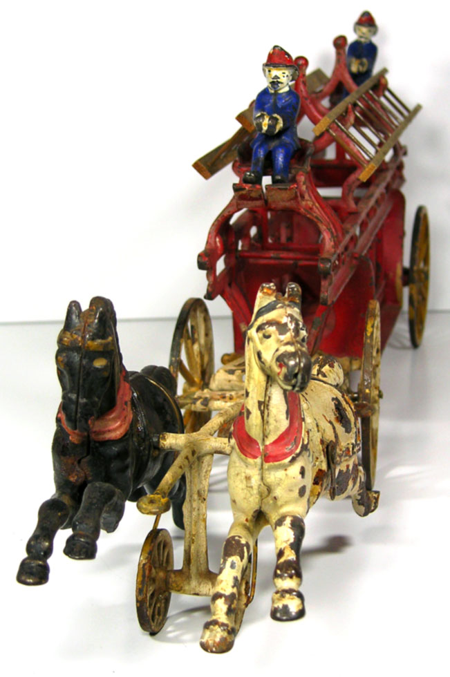 A rare and original, 1890's Oversize, Cast Iron Horse Drawn, Toy Fire Engine Ladder Truck manufactured by Kenton Hardware Co. and a fantastic addition to any Collection!!!