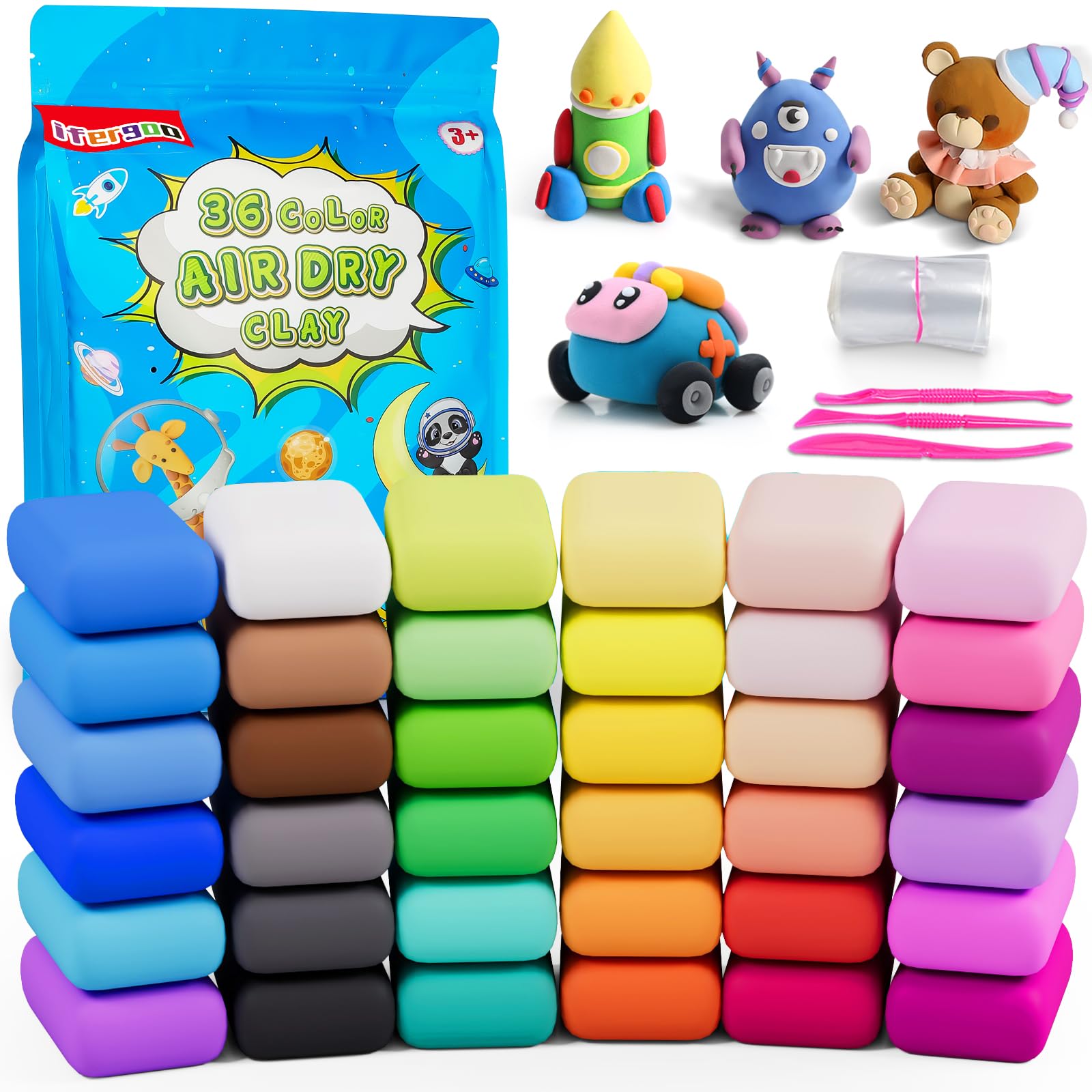 Package Included: 36 colors super light air dry clay 3 x Clay tools 36 x sealed bags 1 x 10 pages tutorial book About Ifergoo Clay: 1. Ifergoo air dry clay is not greasy, doesn't crack or lose shape after drying, and gluten-free, BPA Free, and does not contain Phthalates. 2. The magic clay is ultra light, eco-friendly and non-toxic. 3. The modeling Clay is very soft, Easy to Stretch and Mix, Won't stick to your hands, Messy free, Natural dry when shaped, Doesn't require baking. Tips: Do not put the clay toy in your mouth. Small parts, Not for children under 3 yrs.