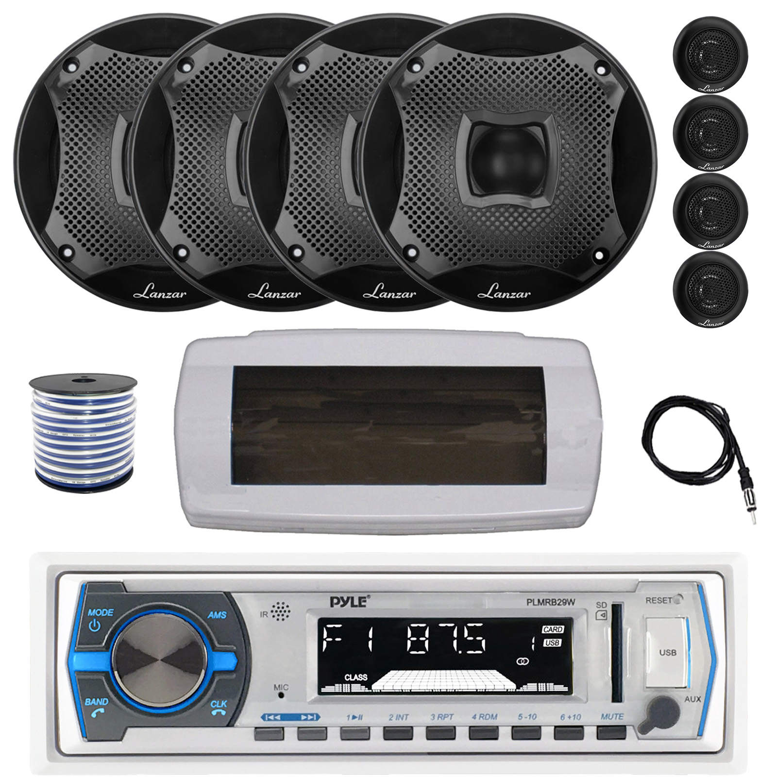Pyle PLMRB29W Single DIN Bluetooth Marine MP3 AM/FM Stereo Receiver with White Cover, 22" Radio Antenna, Wire, 4x 6.5" 450 Watt Peak 2-Way Water Resistant Boat Audio Speakers (Black)