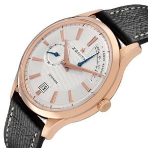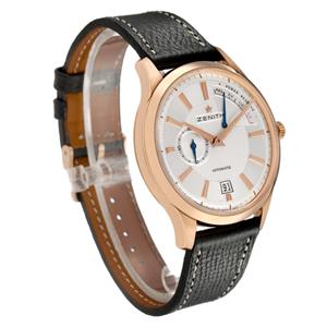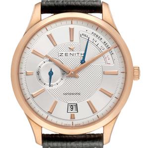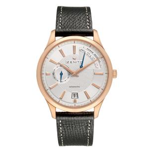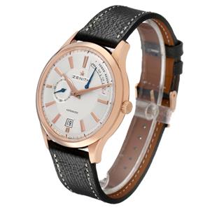 18k rose gold round case 40 mm in diameter. Zenith logo on a crown. |