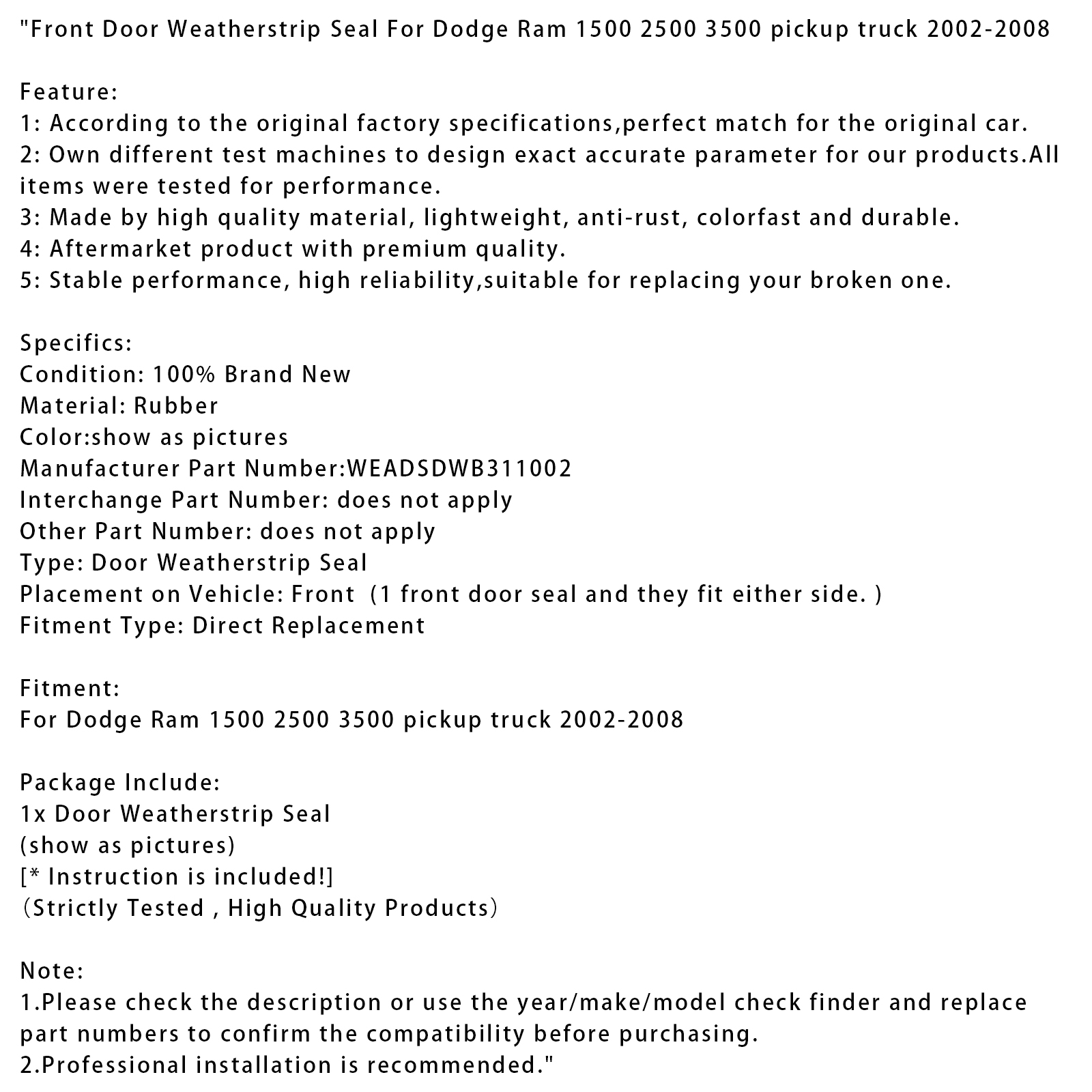 Front Door Weatherstrip Seal For Dodge Ram 1500 2500 3500 pickup truck 2002-2008